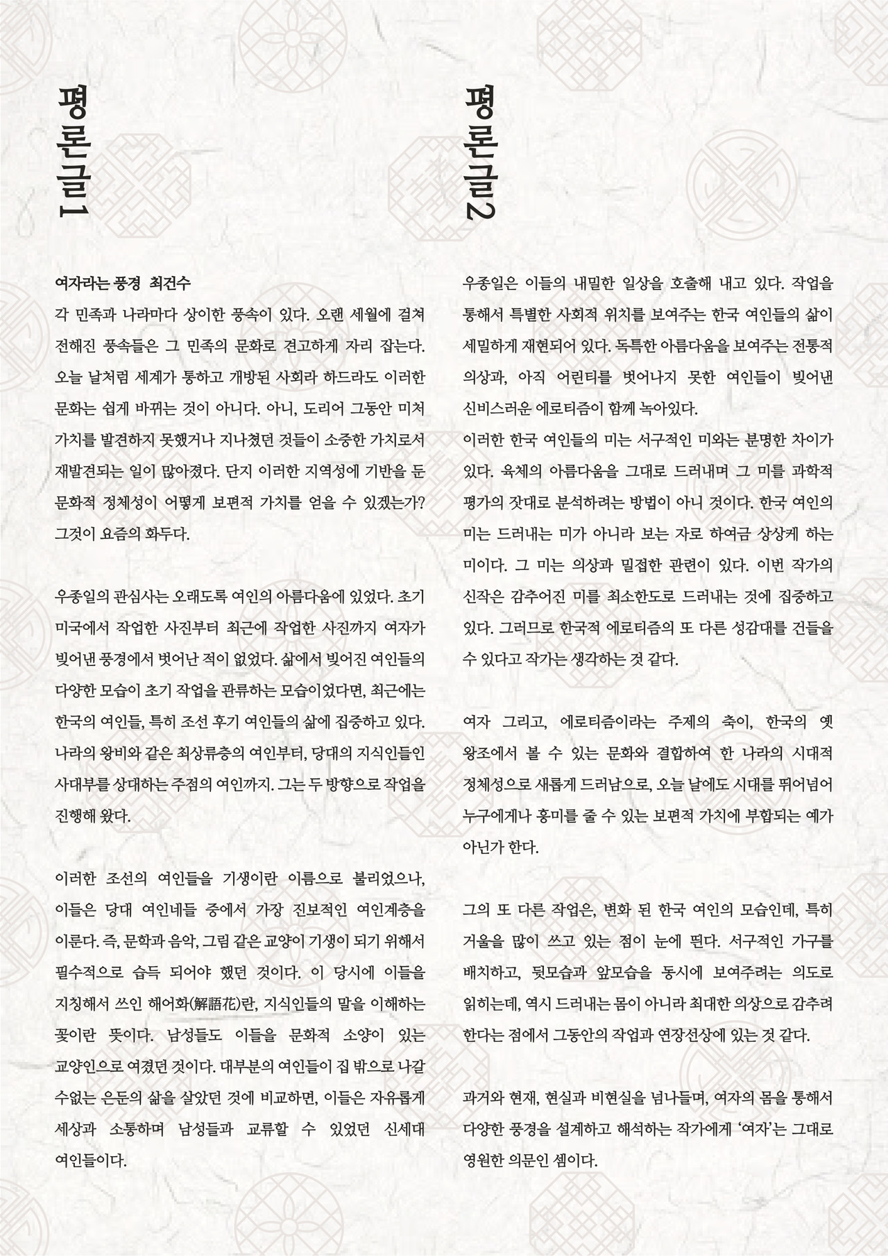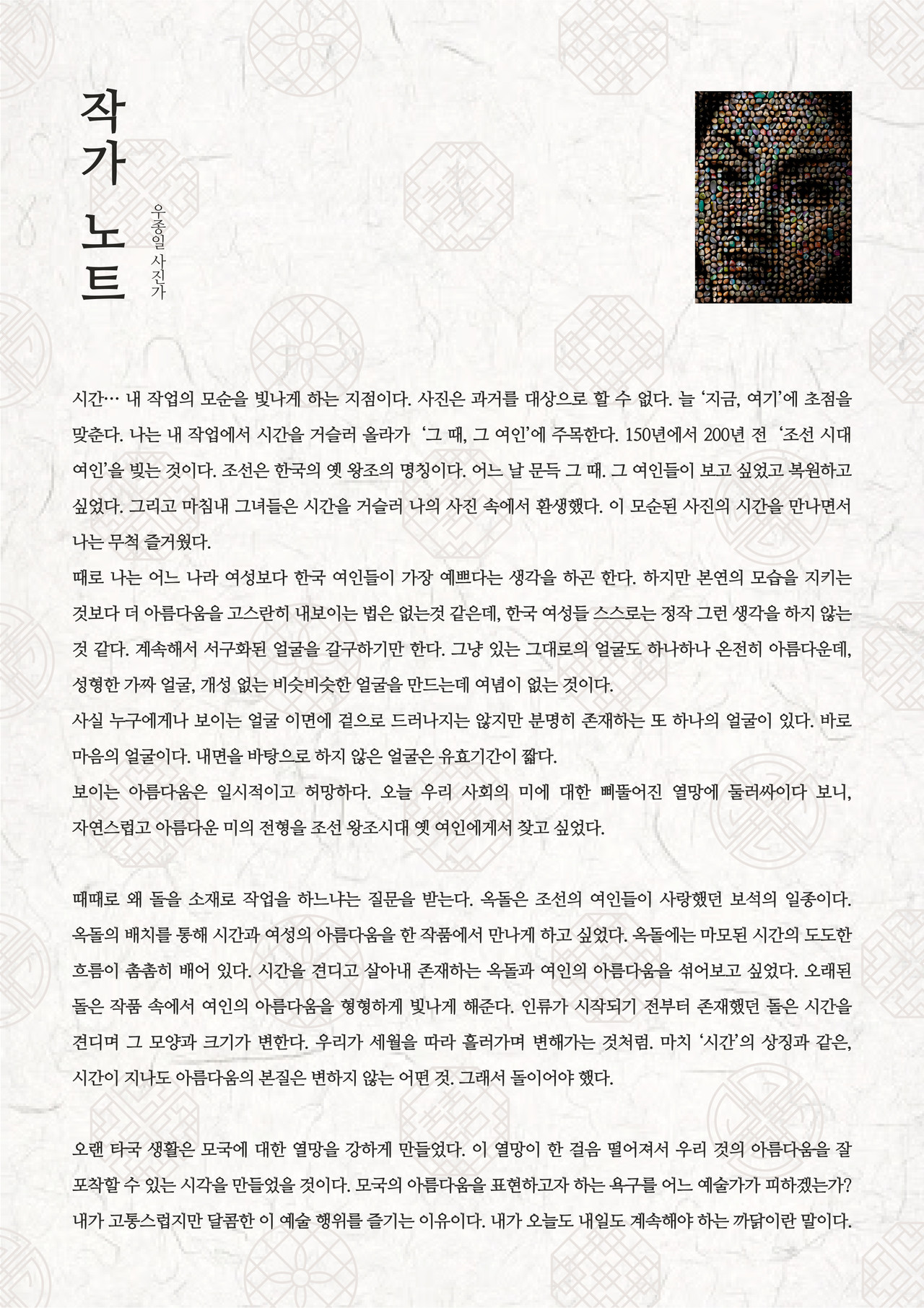 매번 그의 작품은 논의의 중심에 있었기에 이번 신작에 대한 기대 역시 크다. 출품 작품은 역사 속에 널리 알려진 인물을 현대적인 인물로 재촬영을 통하여 미술과 한국 근대사에 대한 재해석을 엿볼 수 있다. 투명한 피부 질감대신 반짝거리는 작은 돌들이 몸속에 박혀있다. 사진이 회화적 언어의 세례를 입은것이다.이러한 헷갈림은 매체 간의 순수성을 해체 시키는 오늘날의 시각의 길속에 그가 서 있다는 느낌을 준다. 특히 사진의 전면을 촘촘하게 수놓은 듯 화려한 많은 작은 돌들이 때로는 배경으로, 때로는 이미지 주체로서 이중적 기능을 수행하고 있다. 모두 그의 정밀한 촬영을 통하여 무생물이 새로운 생명력을 부여 받은 것들이다. 사진과 그림의 혼성, 과거와 현재의 결합으로, 전통적 사진의 특성인 ‘지금, 여기’는 소멸된다. 이것이 사진인가? 이러한 헷갈림은 매체 간의 순수성을 해체 시키는 포스트모던 시각 예술 속에 작가가 서 있음을 이해할 때 자연 풀어진다. 보는 자는 무생물들이 생기를 받고, 살아있는 것과 하나로 융합을 꿈꾸는 둥근 일원적 세계의 메시지에 일단 안심 될 것이다. 무엇보다도 이번 작품들에서 맛깔스럽고 재미있는 요소는 마치 밑그림처럼 쓰이고 있는 수많은 작은 돌들이다. 그것들은 발광 다이오드처럼 이들 작품에 생기를 불어 넣어준다. 작가 우종일이 오랜 고심한 정교한 스투디움(studium)이다. 작은 돌들 속에서 예기치 않은 풍크툼을 만날지도 모른다.