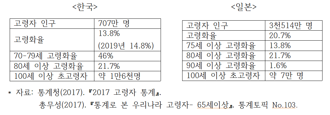 일본의 경우(총무성,2017)는 2015년에 80세 이상 인구가 1,000만 명을 넘었고, 우리나라의 경우(통계청, 2017)는 2016년에 80세 이상 인구가 150만 명을 넘었지만 일본보다 우리나라의 고령화 속도가 한결 빠르게 진행되고 있어 고령화는 국가경제성장, 개인복지, 돌봄문제 등 다양한 분야에 심각한 영향을 미칠 것으로 전망된다.