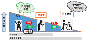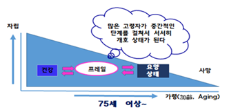 평균수명 100세 시대에 가장 큰 부담으로 다가오는 것이 허약(프레일, Frail)을 예방하면서 건강하게 사는 것과 돌봄문제다. 우리나라의 베이비붐 세대는 9년에 걸쳐 1955년부터 1963년에 태어난 사람들로서 이들 세대 모두가 75세 이상이 되는 2040년 경에는 더욱 심각해지리라 본다.