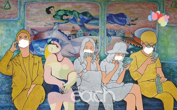 새 유화 작품들과 함께 컴퓨터 작업과 디지털 프린팅을 이용한 작품들이 유화 작품들이 선보인다. 지난 시리즈의 유화작품들을 디지털 프린팅으로 캔버스 위에 프린팅 하였다. 그리고 코로나19 시대를 겪는 2020년의 모습으로 재현하기 위해 등장인물들에게 마스크를 씌우고 피카소, 모딜리아니 등 명화 속 친숙한 인물들을 나란히 어우러지게 그려 넣었다. 승객들 틈에 명화 속 인물들이 함께 앉아 있음으로 해서 "낯설게 하기" 기법의 새로운 시각과 신선미 효과를 높였다. 색조의 효과를 위해 승객과 배경 등 전면적으로 아크릴 물감 작업을 가미했다. 그리고 마지막 레이어 작업으로 스마트폰을 통과하며 화보 편집용 이모지(이모티콘)를 그림 위에 덧붙임으로써, 코로나19 전쟁 시국의 극복을 기원하는 마음으로 친숙하고 위트 있는 스마트폰 중심 문화생활로 화면 분위기 전환을 시도해 보았다.