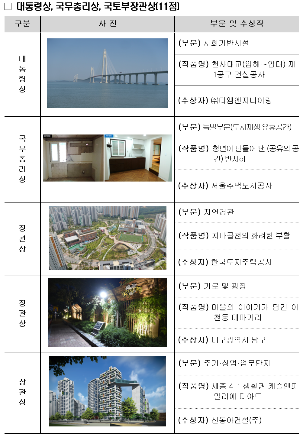 ㅇ (대통령상) ‘천사대교’는 1004개의 섬으로 구성된 신안군 도서지역을 연결하는 세계최초로 FCM 주두부에 케이블 정착 방식을 도입한 세계최장(주경간길이: 510m) 고저주탑 사장교로서, 주변 섬의 형성과 어우러져 서해안을 대표하는 새로운 지역경관을 조성했다는 점에서 높은 평가를 받았다.