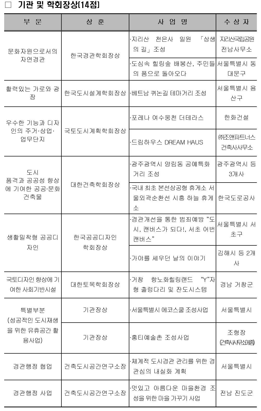 시상식은 7. 16(목) 9시부터 11시까지 대한건축사협회 회관(서울 서초 소재)에서 진행되며, 각 분야의 수상자와 국토교통부 손명수 제2차관을 비롯하여 관련 전문가 등 약 150여 명이 참석할 예정이다.