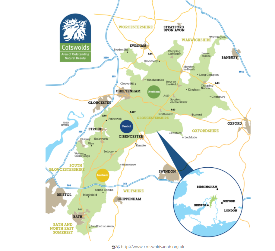 남부 중앙 잉글랜드 중 코츠월드 구릉 지대를 포함하고 있는 6개 주 지역을 묶어 일컫는 말인 코츠월드(Cotswolds)는 이 일대의 자연적 풍경이 너무 아름다워 보존할 가치가 있다는 결정 하에 AONB(Area of Outstanding Natural Beauty)로 지정되었다.