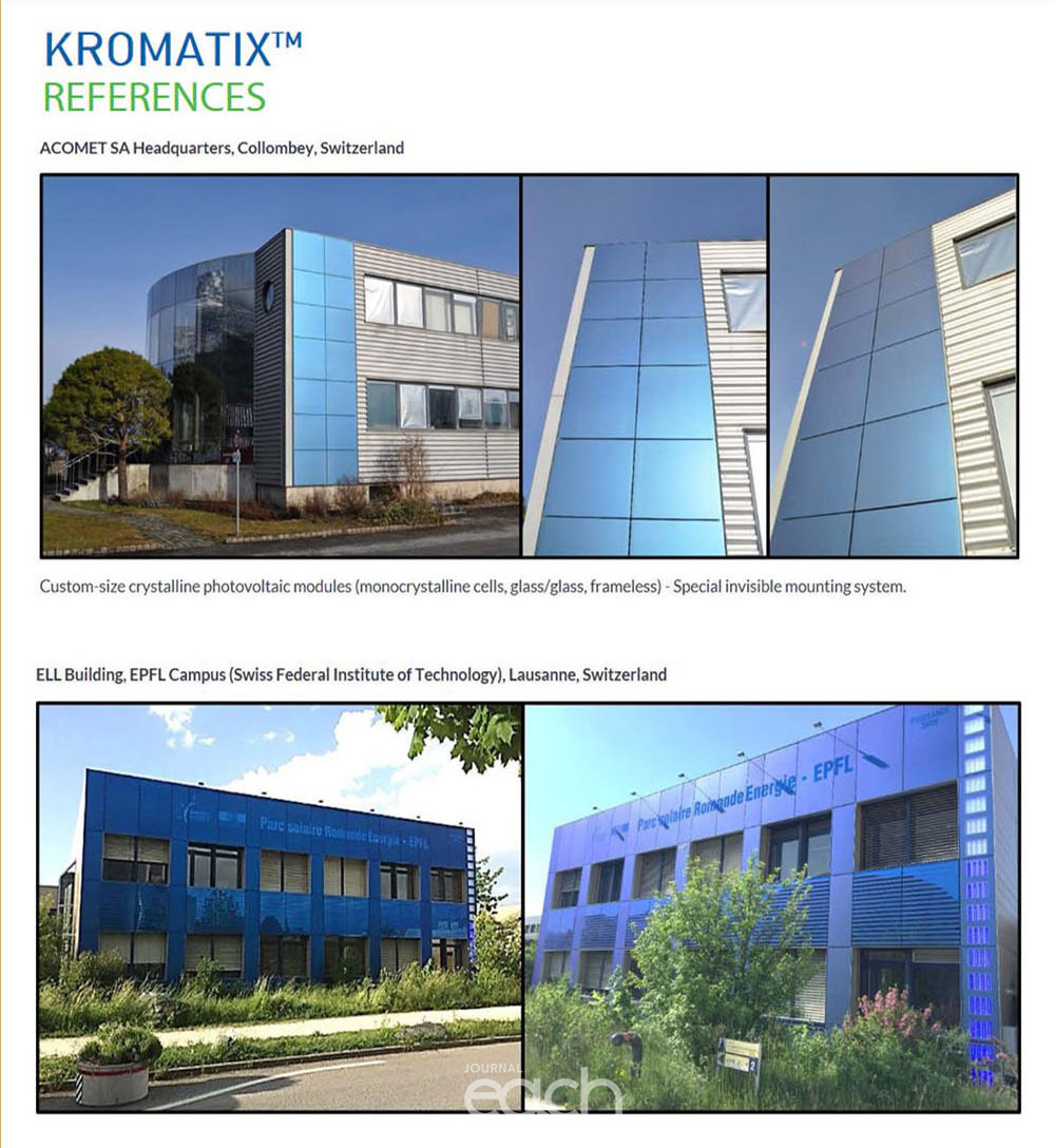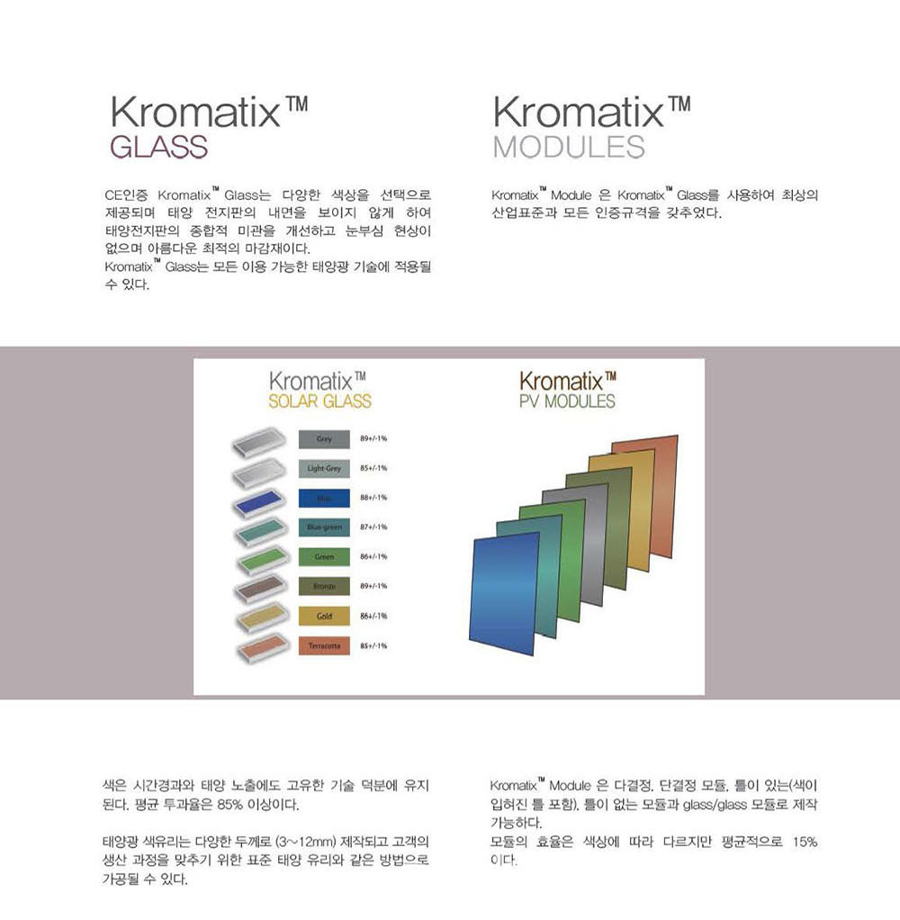 크로마틱스 모듈은 일반형 BIPV와는 달리 태양전지가 보이지 않기 때문에 건물 외부를 아름답게 꾸미기 위한 건축자재로 적용 가능하다. 크로마틱스 모듈은 210종류의 다양한 색상구현으로 건물의 심미적 효과를 높이는 것뿐만 아니라 제로에너지빌딩 구현을 위한 재생에너지 생산까지 더해 최근 더욱더 주목받고 있는 제품이다.