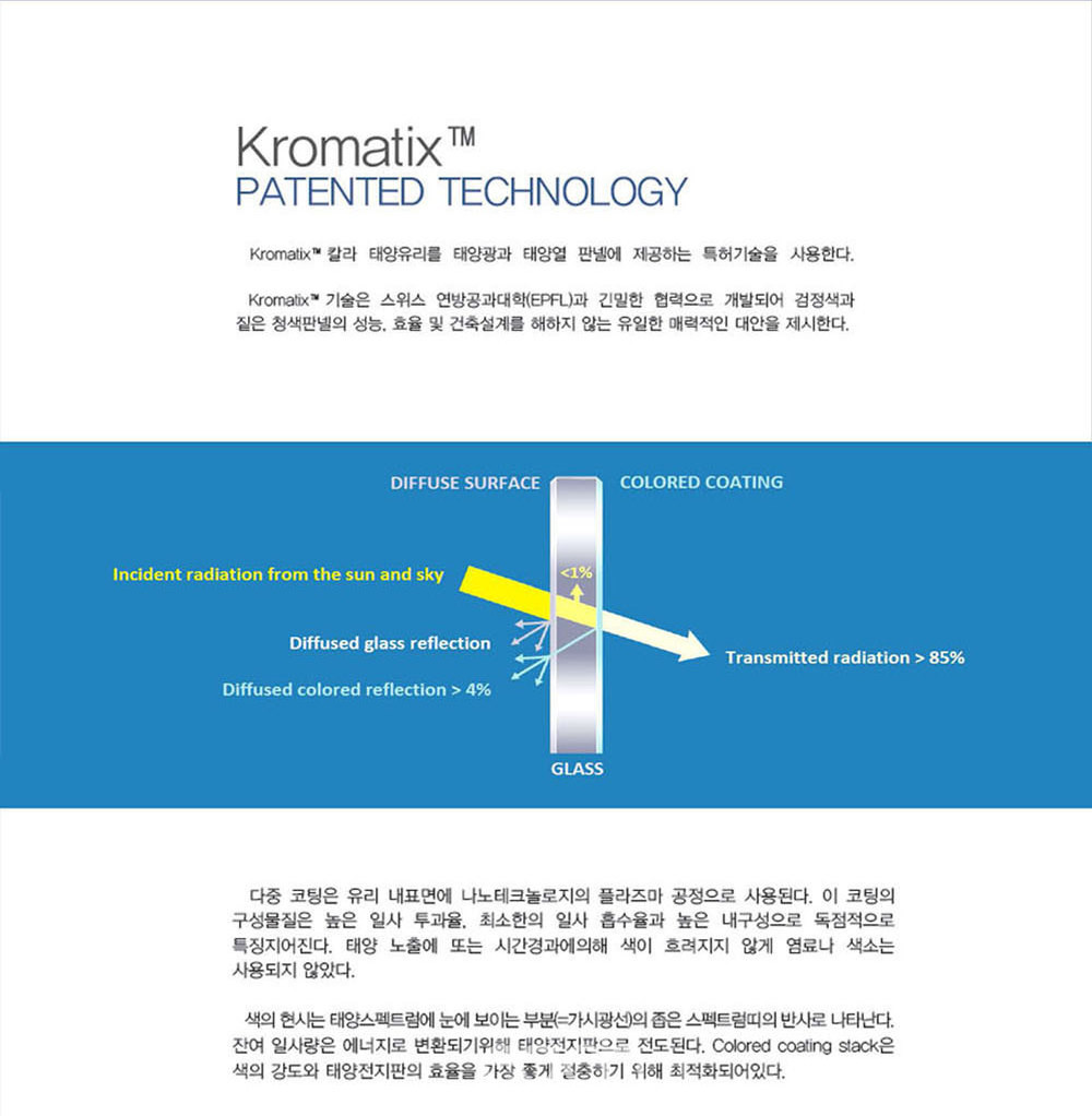 또한, 크로마틱스 모듈은 고유의 기술력으로 장시간 태양에 노출이 되어도 색상이 그대로 유지될 뿐 아니라 평균 투과율도 85% 이상에 달하며, 기존 태양광 모듈 표준크기는 물론 고객이 원하는 사이즈 및 두께로도 제작이 가능하다. 크로마틱스 모듈은 다결정/단결정 모듈, 프레임이 있는/없는 모듈 등 다양하게 제작이 가능하다. 모듈 효율은 210가지의 다양한 색상을 표현할 수 있으면서도 높은 효율을 자랑하고 있다. 두께 3~12mm, 최대 3,210mm x 6,000mm 크기로 설계조건에 따라 다양하게 제작할 수 있으며, 건물의 외벽, 발코니 등 다양한 장소에도 적용이 가능하다.