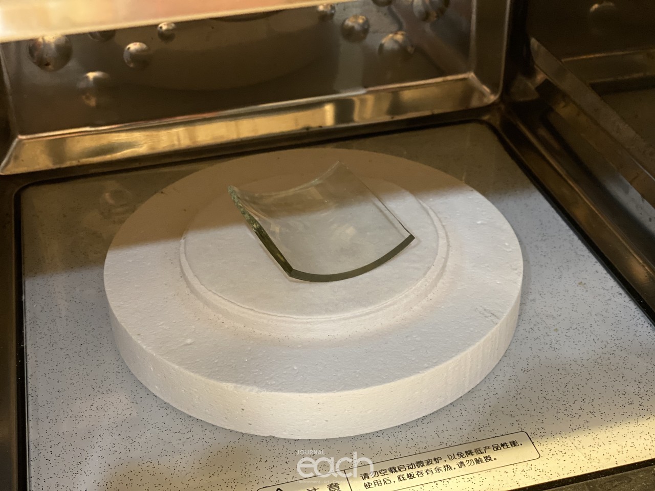 전자레인지의 출력과 유리의 두께에 따라서, 시간의 조건에 차이가 있지만, 일정한 시간 조건이 충족되면, 사진에서와같이, 유리병이 판유리의 형태로 펼쳐지게 된다.