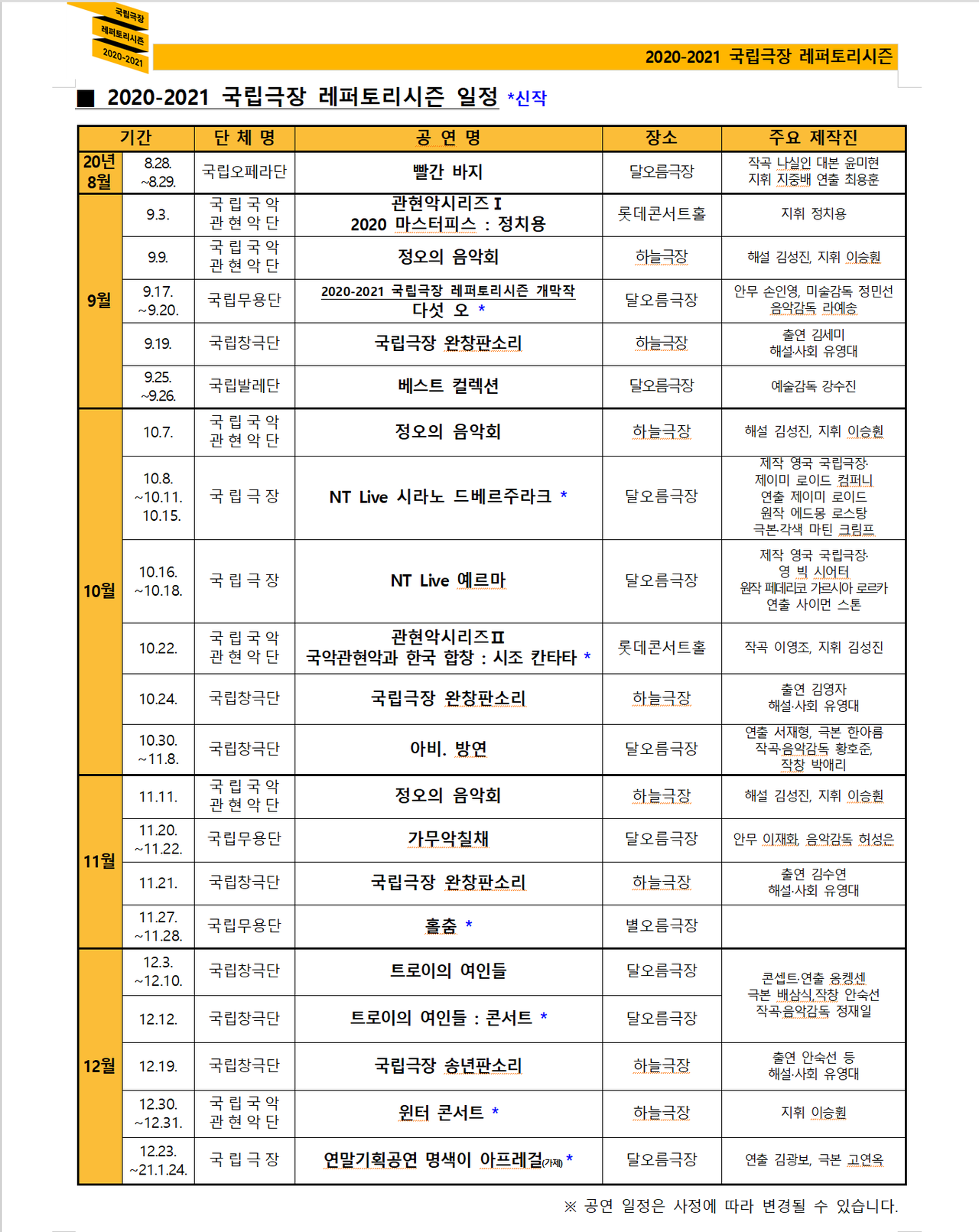 아홉 번째를 맞이하는 국립극장 레퍼토리시즌은 국립극장 전속단체인 국립창극단·국립무용단·국립국악관현악단의 공연을 비롯해 국립극장 연말기획공연, NT Live(엔티라이브), 해외초청작 등으로 구성된다. 지난 7월 22일부터 국립극장 홈페이지를 통해 패키지 티켓 판매가 시작됐으며, 24일부터 공연별 티켓도 구매할 수 있다.