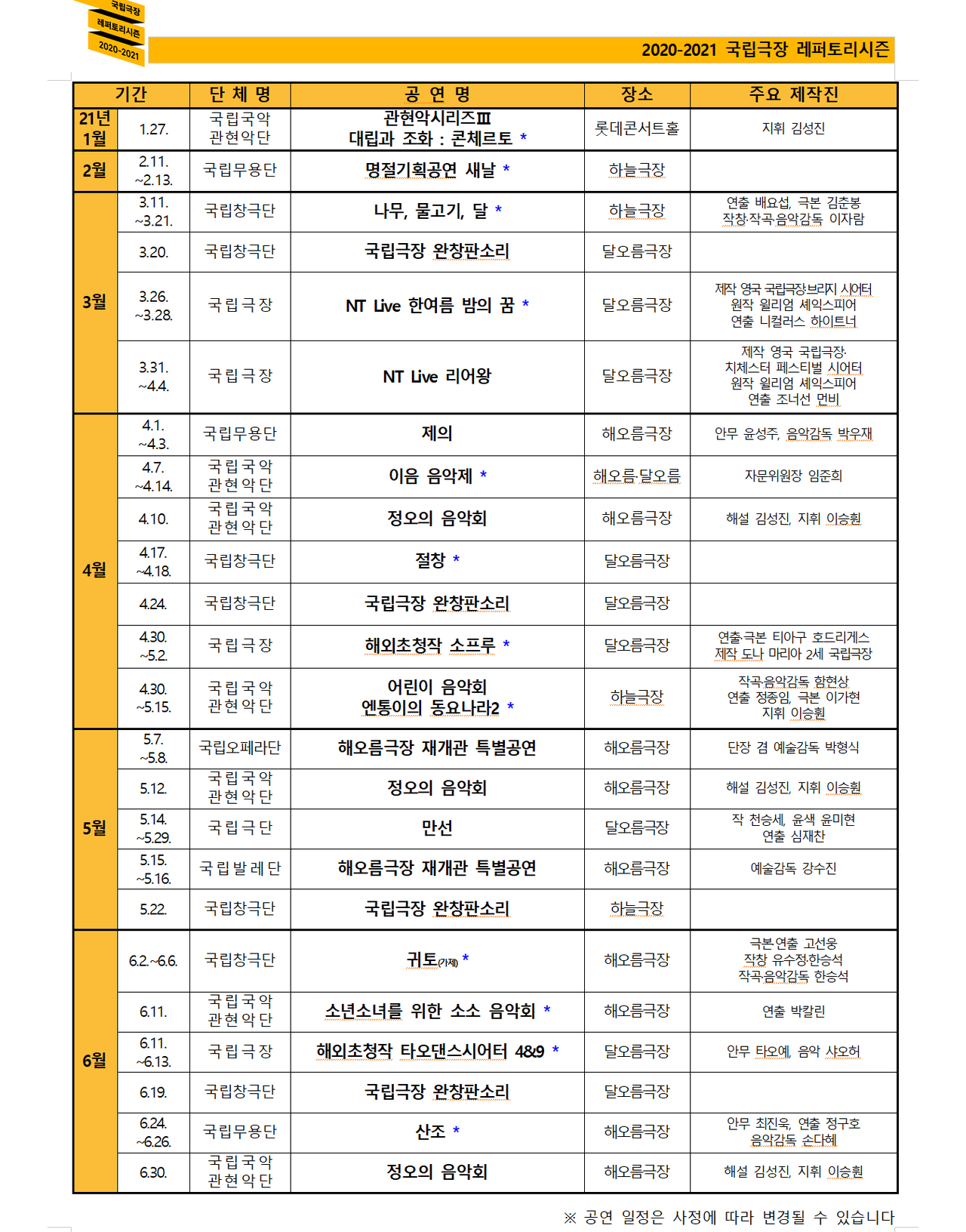 국립극장 전속단체는 물론 외부 국립예술단체들이 함께 꾸미는 이번 시즌은 2020년 국립극장 70주년, 2021년 해오름극장 재개관을 기념한다는 점에서 더욱 뜻깊다. 만 3년 만에 처음으로 관객을 맞이하는 해오름극장의 재개관 기념작은 우리 민족의 의식무용을 총망라한 국립무용단의 ‘제의’이다. 국립무용단 전원이 출연하여 새롭게 문을 연 해오름극장의 힘찬 출발을 기원한다(안무 윤성주, 음악감독 박우재, ‘21년 4월 1~3일). 국립국악관현악단은 국악과 클래식 음악, 설치미술 등 다양한 장르와 함께 전통음악을 새롭고 자유로운 시선에서 풀어내는 창작음악 축제 ‘이음 음악제’를 해오름극장과 달오름극장에서 일주일간 펼친다(4월 7~14일). 국립창극단은 수궁가를 바탕으로 한 대형 신작 ‘귀토’(가제)를 새 해오름 무대에 올린다. 초연 후 매번 만원사례를 기록하며 ‘국민 창극’이라는 수식어가 붙은 ‘변강쇠 점 찍고 옹녀’의 제작진이 참여한다(극본·연출 고선웅, 공동작창 유수정·한승석, 6월 2~6일). 국립무용단과 ‘향연’ ‘묵향’이라는 굵직한 자취를 남긴 정구호는 안무가 최진욱과 함께 신작 ‘산조’를 새로운 해오름 무대에 올린다(6월 24~26일).