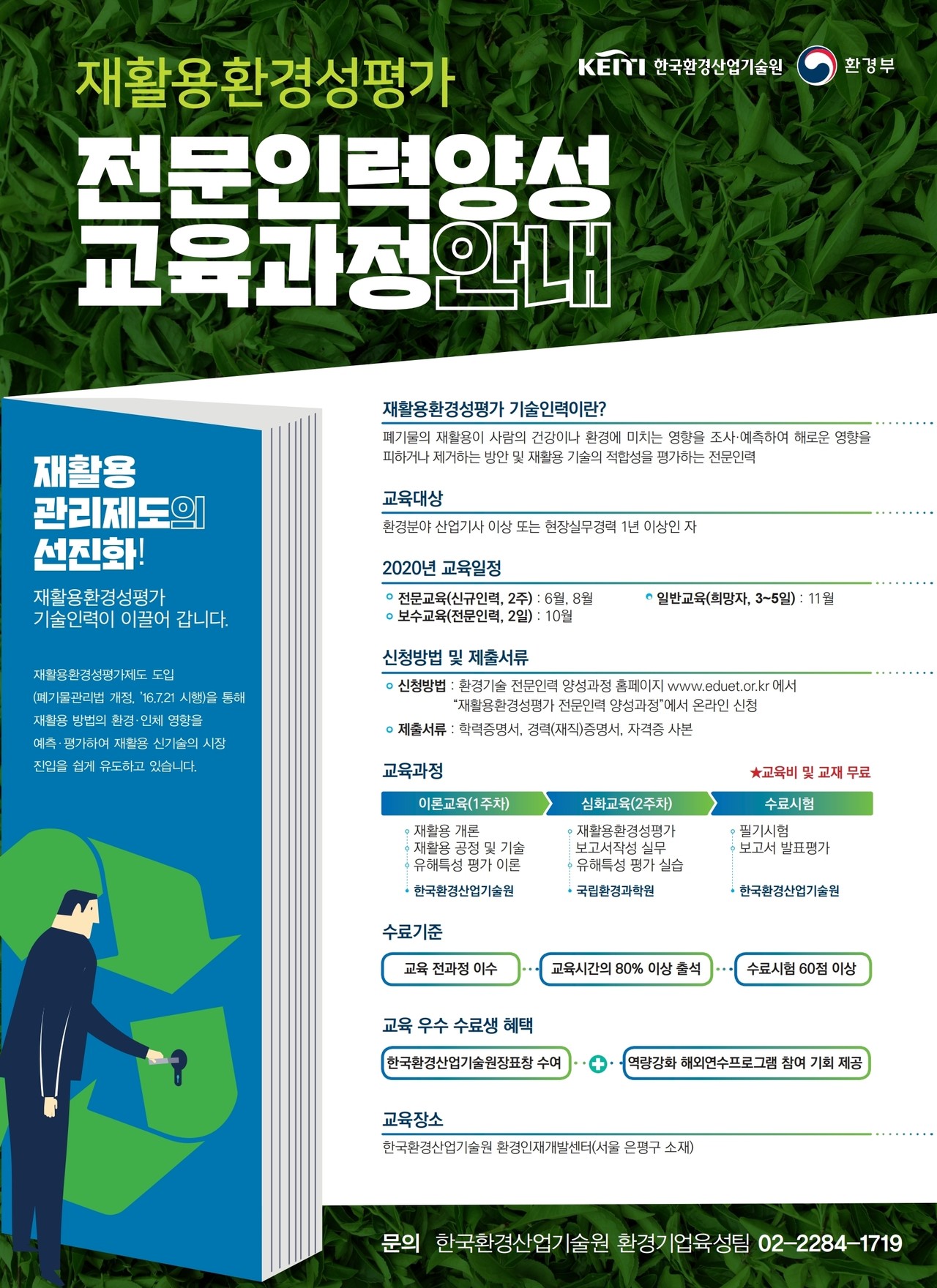 한국환경산업기술원에서는 「폐기물관리법 」제13조의3, 제13조의4, 제35조 및 시행규칙 제50조(폐기물 처리 담당자 등에 대한 교육)에 따라, “재활용환경성평가 전문인력 양성과정”을 운영하고 있습니다.