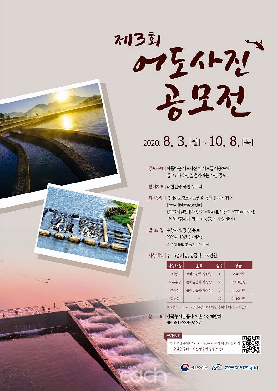 접수된 응모작은 사진 및 어도전문가들의 심사를 거쳐 해양수산부 장관상(대상), 농어촌공사 사장상(최우수상) 등 16점에 대하여 총 650만원의 상금이 주어진다.