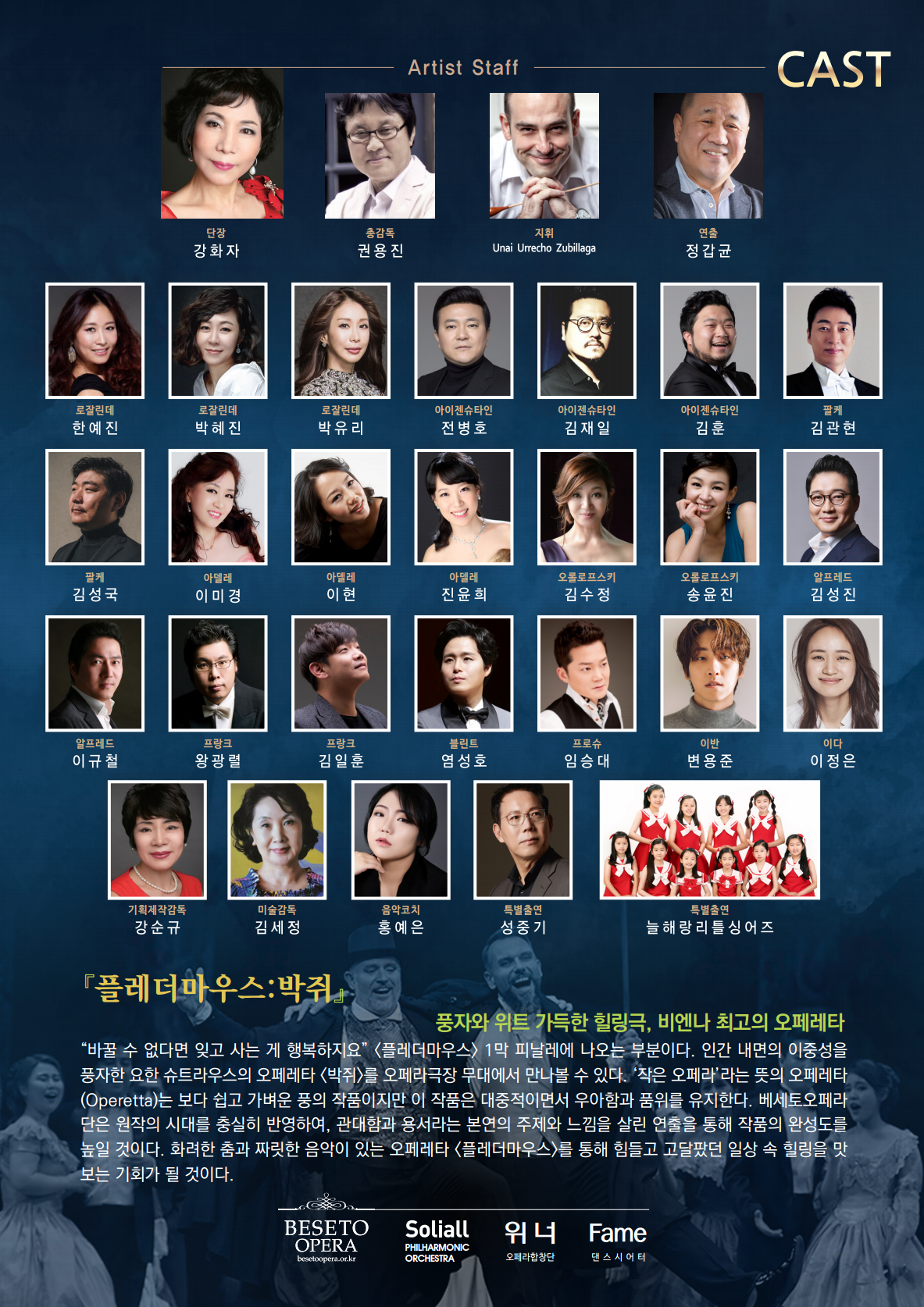 또한 아이젠슈타인역의 김훈(라스칼라 주역), 김재일 그리고 팔케역의 김성국 이들은 외국에서 주 활동을 하는 성악가로서 좋은 기회로 이번 공연에 참여하게 되었다. 그들이 가지고 있는 무한한 잠재력과 가능성을 키울 수 있는 공연의 하나로 힘써 준비하고 있다.