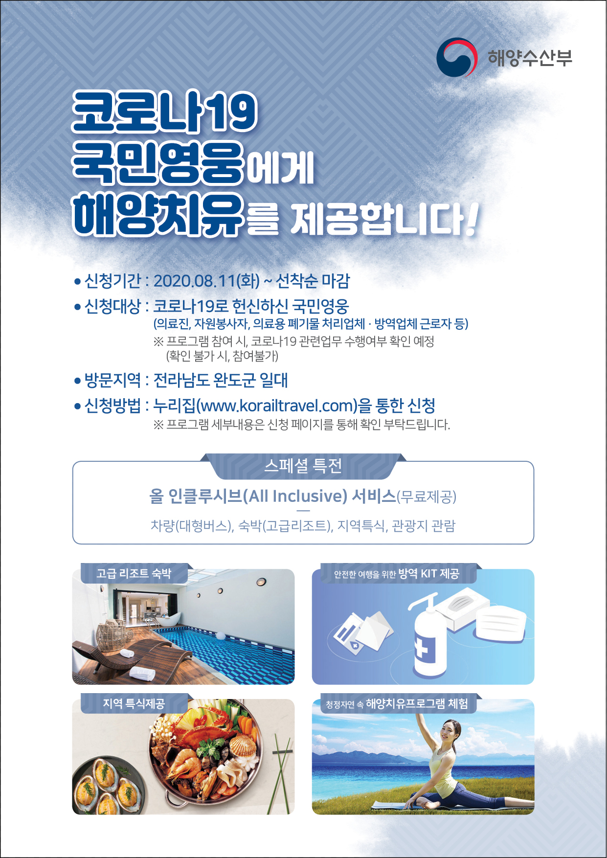 코로나19 대응을 위해 쉼 없이 헌신해온 국민영웅들에게 휴식을 제공하기 위해 8월 12일(수)부터 11월 6일(금)까지 전국 코로나19 국민영웅(공무원 제외)을 대상으로 ‘해양치유·관광 체험프로그램’을 운영한다.