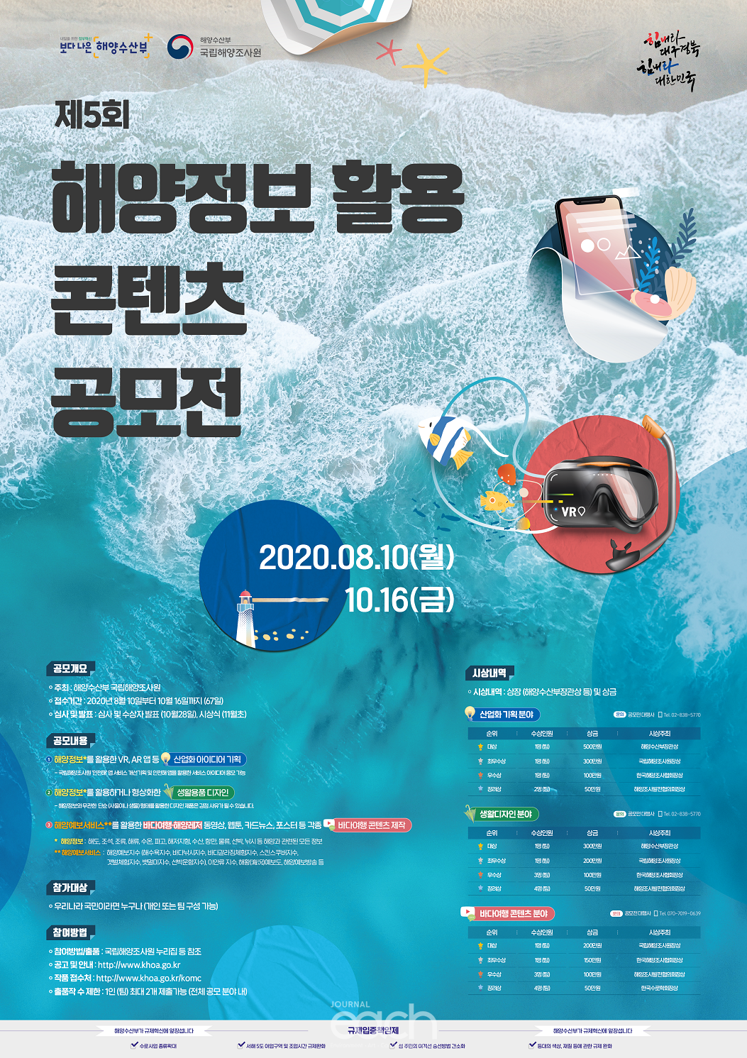 5회 째를 맞은 이번 공모전은 8월 10일부터 10월 16일까지 두 달간 진행되며, 공모분야는 ①해양정보를 활용한 가상현실(VR), 증강현실(AR), 스마트폰 앱(App) 개발 등 ‘산업화 기획’ 부문, ②해양 관련 이미지를 활용한 디자인을 출품하는 ‘생활디자인’ 부문, ③해양예보정보를 활용한 콘텐츠 분야로 나누어 진행한다. 우리나라 국민이라면 누구나 자유롭게 참가할 수 있다.