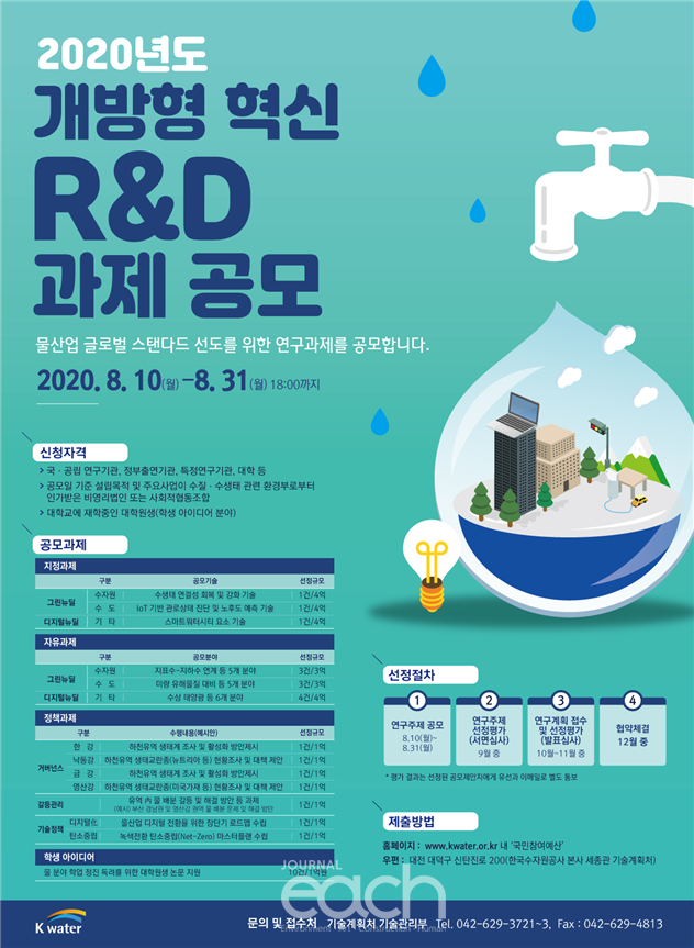 한국수자원공사(사장 박재현)는 수요자인 국민 중심의 물관리 강화를 위해 국내의 대학과 정부출연기관, 연구기관 등을 대상으로 8월 10일부터 31일까지 ‘개방형 혁신 연구 개발(R&D)’ 과제를 공모한다.