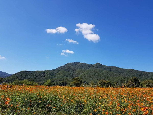 물의정원은 온통 황색 코스모스로 물들어 있습니다. 황색 물결 출렁이는 드넓은 바다입니다. 사람들은 그 바다에 들어가 사진을 찍기도 하고, 온통 황색의 꽃이 양 옆으로 도열하고 있는 꽃길을 따라 즐겁게 걷기도 하며, 돗자리를 펴서 쉼터를 만들고 앉거나 누워서 풍경을 즐기기도 합니다. 나도 황색 바다와 운길산을 배경으로 사진 한 장을 찍었습니다. 사진을 찌고 나면 늘 어색한 얼굴 표정이 마음에 들지 않아 주로 자연의 배경 사진만 찍는데, 오늘은 셀카봉을 길게 뽑아 내 얼굴이 나오도록 찍어보았습니다. 역시 맘에 들지 않지만 배경이 좋으니 봐줄만 하다고 위로해 봅니다.