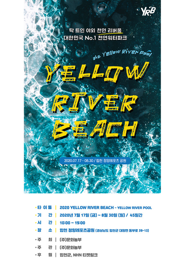 맑은 물과 깨끗한 모래사장, 천혜의 자연에서 펼쳐지는 합천 황강변의 천연워터파크, 옐로우리버비치! 인위적인 놀이가 아닌 천연, 자연 그대로를 즐길 수 있는 옐로우리버비치 시즌6은 좀 더 환경친화적인 프로그램을 구성해 남녀노소 누구나 뛰어놀 수 있는 여름 물놀이 문화를 구축한다. 그리고 워터파크 / 레저 / 푸드 / 캠핑 / 힐링까지 YRB만의 환상적인 여름 축제를 제공한다. 탁 트인 자연에서 걱정없이 안심하고 올 여름을 즐길 수 있는 축제이다.