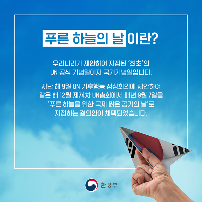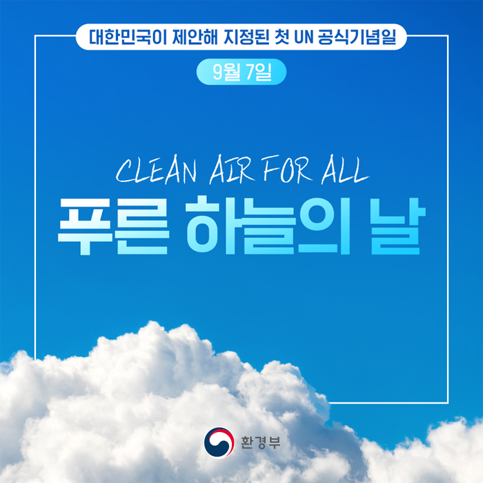 지난 해 9월 UN 기후행동 정상회의에 제안하여 같은 해 12월 제 74차 UN총회에서 매년 9월 7일을 ‘푸른 하늘을 위한 국제 맑은 공기의 날’로 지정하는 결의안이 채택되었습니다.