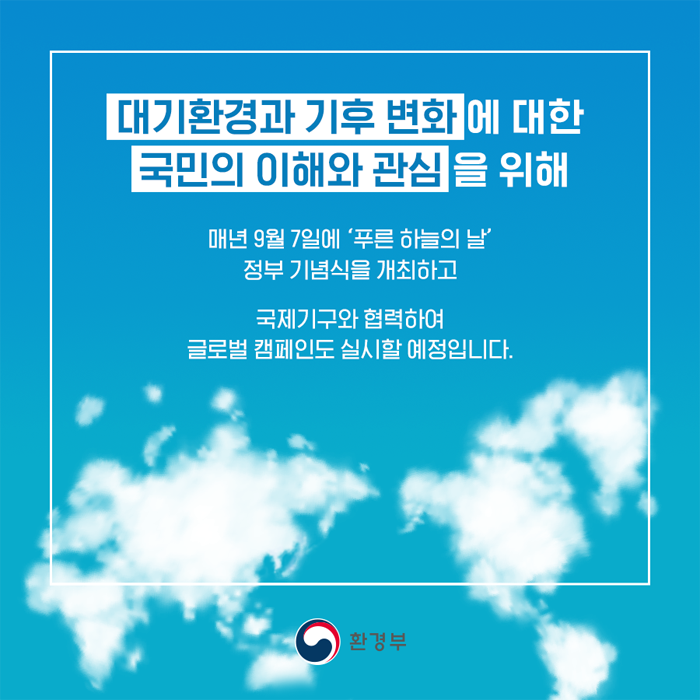 대기환경과 기후 변화에 대한 국민의 이해와 관심을 위해 매년 9월 7일에 ‘푸른 하늘의 날’ 정부 기념식을 개최하고 국제기구와 협력하여 글로벌 캠페인도 실시할 예정입니다.