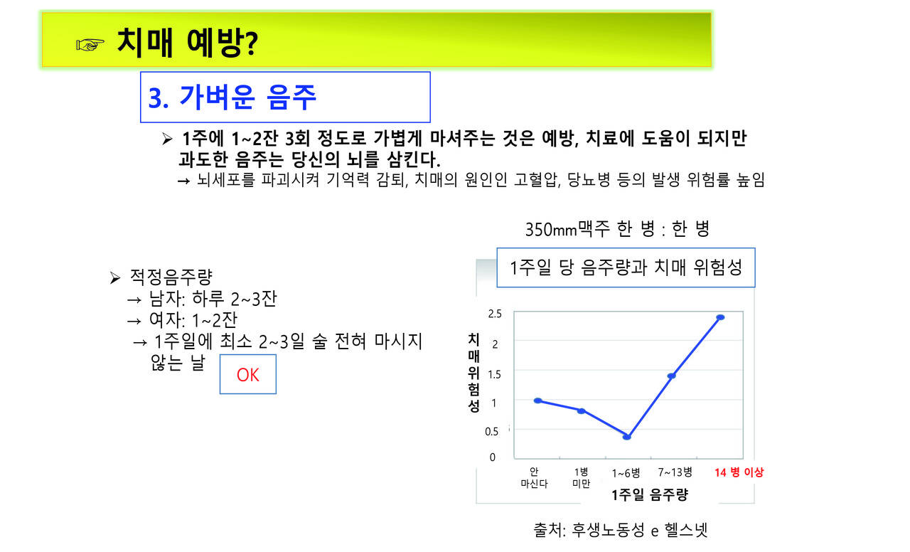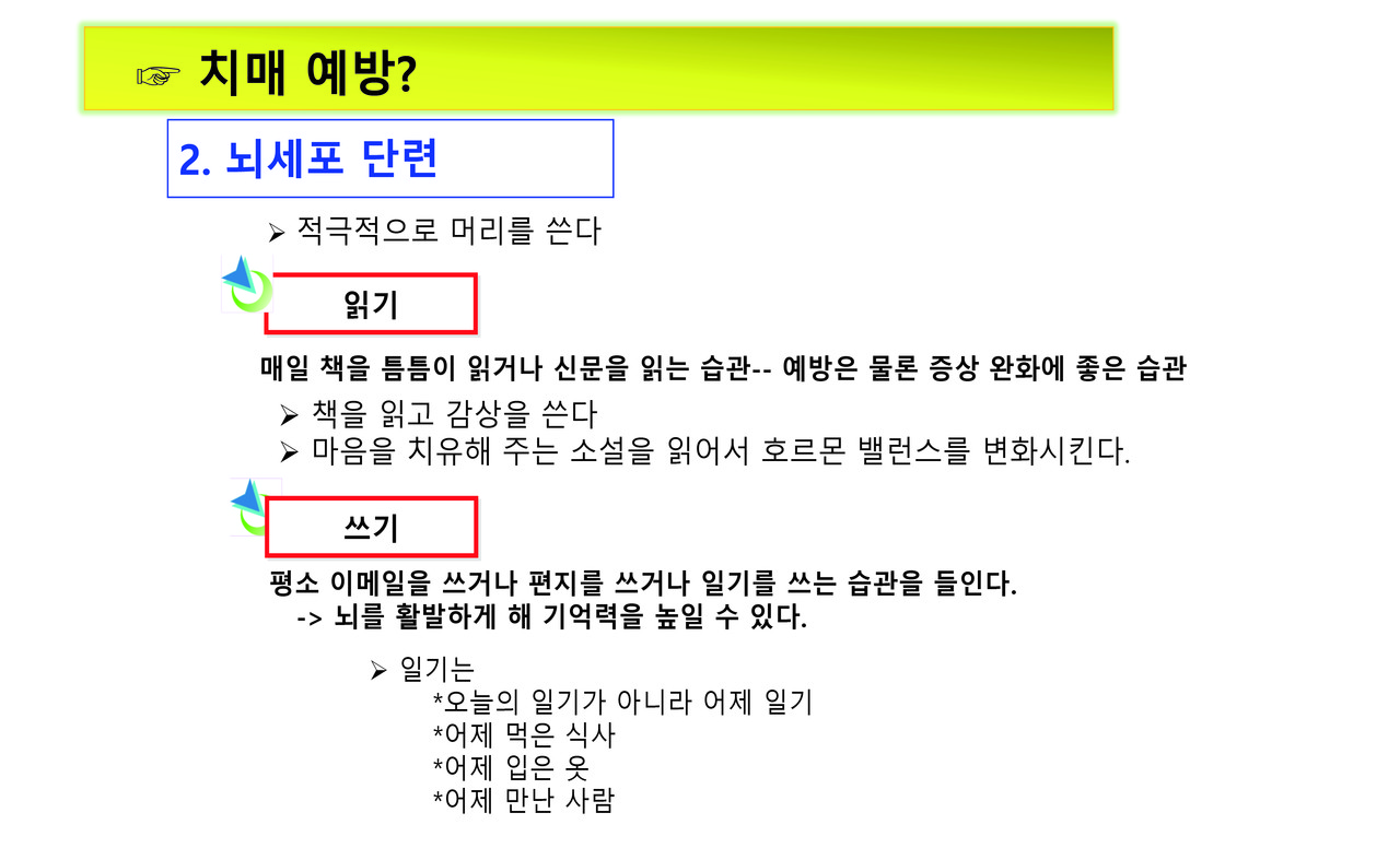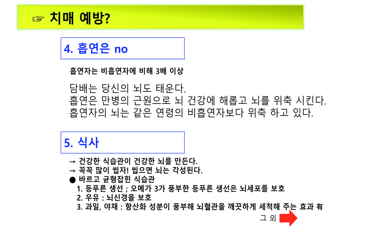 키워드 #치매예방 #주경복 #두뇌유산소운동 #뇌세포단련 #가벼운음주 #흡연no #식사 #뇌자극 #인간관계 #건강한환경 #뇌를착각하게하자 #심호흡 주경복 each-j@naver.com 다른기사 보기 저작권자 © 이치저널(each journal) 무단전재 및 재배포 금지 당신만 안 본 뉴스 새만금국제공항과 철도 연결, 48km의 경제동맥이 열린다 쿠바 전역에 ‘여행경보 1단계(여행유의)’ 발령, 모기매개 전염병 급증 징후 화산과 바다가 만든 걸작, 부안 지질유산...부안 격포리와 솔섬 농촌 재생에너지 전환, 이제는 영농형 태양광이 중심 2025년 스마트도시 지도 바뀌다… 9개 도시 신규 인증 ‘나만 괜찮다’는 교차로 꼬리물기, 자동 단속장비 AI가 직접 잡는다 남미 가뭄 뚫은 한국 기술… ‘가뭄에 강한 콩’ 현지서 성공 새만금국제공항과 철도 연결, 48km의 경제동맥이 열린다 댓글삭제 삭제한 댓글은 다시 복구할 수 없습니다. 그래도 삭제하시겠습니까? 비밀번호 닫기 기사 댓글 0 댓글 접기 로그인 후 이용 가능합니다. 댓글 내용입력 비회원 로그인 이름 비밀번호 댓글 내용입력 댓글쓰기 계정을 선택하시면 로그인·계정인증을 통해 댓글을 남기실 수 있습니다. 회원 로그인 비회원 글쓰기 이름 비밀번호 자동등록방지 로그인 옵션 창닫기 주요기사 내년, 광역버스 지도가 바뀐다… 광명·부천·수원·용인·이천까지 ‘준공영제 직행 확장’ 죽전테라스앤139, 폭행 의혹·점유 충돌·극단 선택 시도까지… 교보자산신탁 관리사업에서 갈등 폭발 바이러스보다 무서운 염증 ,,,엠폭스 중증화의 스위치, AIM2가 밝혀졌다 국세 카드납부 수수료 12월 2일 전면 인하… 영세사업자 부담 절반으로 국민연금 추후 납부, 보험료율 새 기준 적용… 내년부터 달라진다 산부인과·소아외과 의사, 의료사고 배상액 국가가 최대 15억 보장