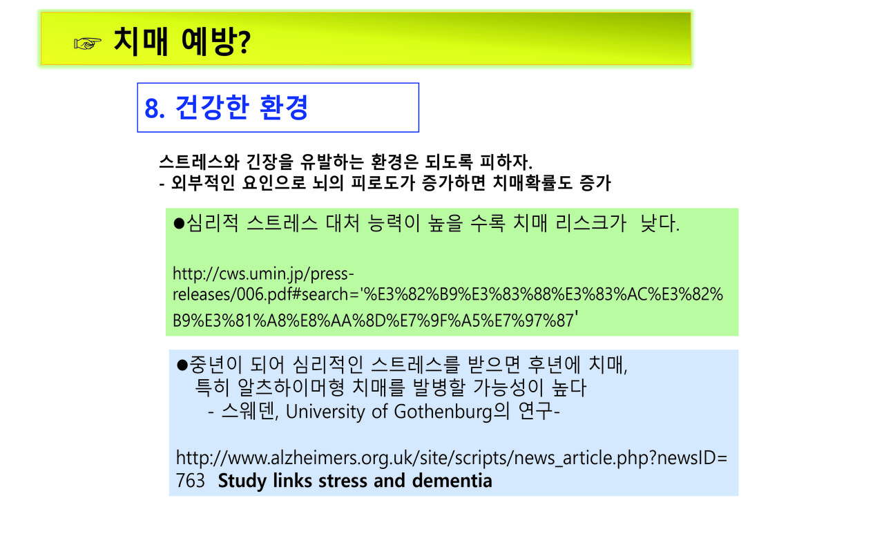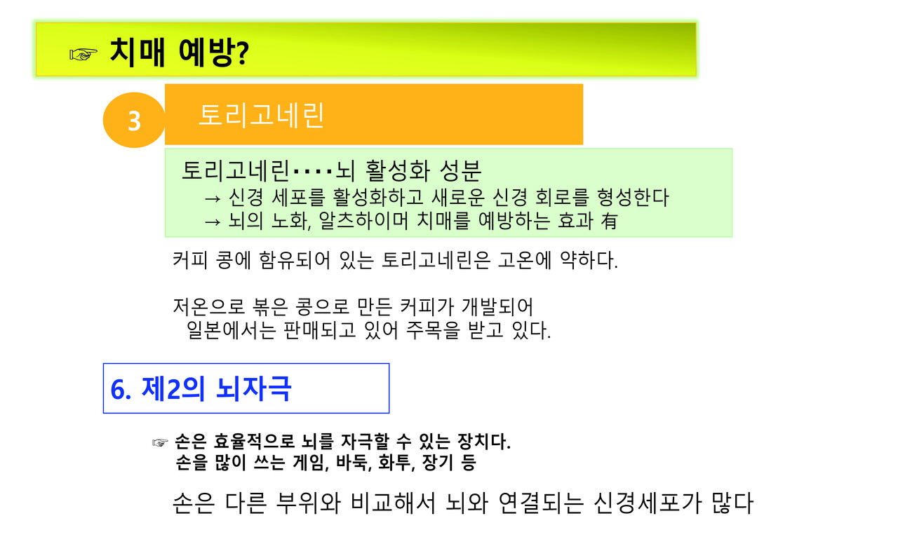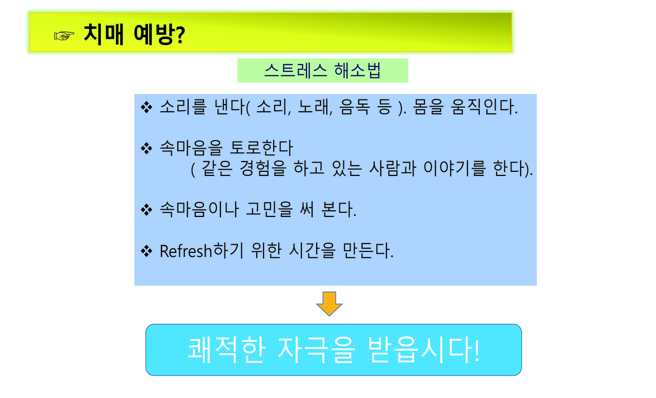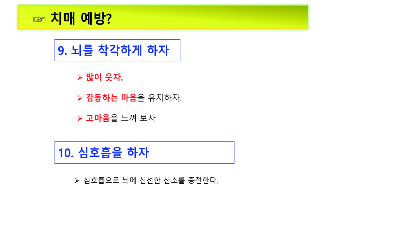키워드 #치매예방 #주경복 #두뇌유산소운동 #뇌세포단련 #가벼운음주 #흡연no #식사 #뇌자극 #인간관계 #건강한환경 #뇌를착각하게하자 #심호흡 주경복 each-j@naver.com 다른기사 보기 저작권자 © 이치저널(each journal) 무단전재 및 재배포 금지 당신만 안 본 뉴스 새만금국제공항과 철도 연결, 48km의 경제동맥이 열린다 쿠바 전역에 ‘여행경보 1단계(여행유의)’ 발령, 모기매개 전염병 급증 징후 화산과 바다가 만든 걸작, 부안 지질유산...부안 격포리와 솔섬 농촌 재생에너지 전환, 이제는 영농형 태양광이 중심 2025년 스마트도시 지도 바뀌다… 9개 도시 신규 인증 ‘나만 괜찮다’는 교차로 꼬리물기, 자동 단속장비 AI가 직접 잡는다 남미 가뭄 뚫은 한국 기술… ‘가뭄에 강한 콩’ 현지서 성공 새만금국제공항과 철도 연결, 48km의 경제동맥이 열린다 댓글삭제 삭제한 댓글은 다시 복구할 수 없습니다. 그래도 삭제하시겠습니까? 비밀번호 닫기 기사 댓글 0 댓글 접기 로그인 후 이용 가능합니다. 댓글 내용입력 비회원 로그인 이름 비밀번호 댓글 내용입력 댓글쓰기 계정을 선택하시면 로그인·계정인증을 통해 댓글을 남기실 수 있습니다. 회원 로그인 비회원 글쓰기 이름 비밀번호 자동등록방지 로그인 옵션 창닫기 주요기사 내년, 광역버스 지도가 바뀐다… 광명·부천·수원·용인·이천까지 ‘준공영제 직행 확장’ 죽전테라스앤139, 폭행 의혹·점유 충돌·극단 선택 시도까지… 교보자산신탁 관리사업에서 갈등 폭발 바이러스보다 무서운 염증 ,,,엠폭스 중증화의 스위치, AIM2가 밝혀졌다 국세 카드납부 수수료 12월 2일 전면 인하… 영세사업자 부담 절반으로 국민연금 추후 납부, 보험료율 새 기준 적용… 내년부터 달라진다 산부인과·소아외과 의사, 의료사고 배상액 국가가 최대 15억 보장