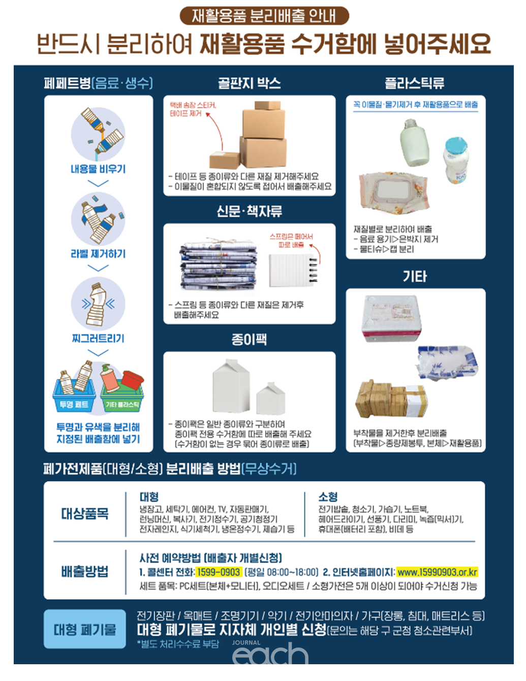 한편, 환경부는 재활용품이 적정하게 분리배출되어 재활용 과정에서 품질을 높일 수 있도록 품목별 분리배출 방법, 재활용품으로 잘못 배출되는 사례를 그림으로 정리하여 8월 말 전국 공동주택에 배포했다.