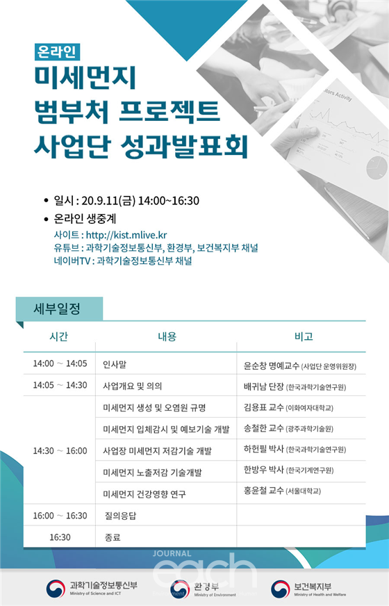 과학기술정보통신부, 환경부, 보건복지부는 미세먼지 범부처 프로젝트 사업 ‘성과발표회’를 9월 11일(금) 오후 2시부터 4시 30까지 온라인으로 개최한다고 밝혔다.