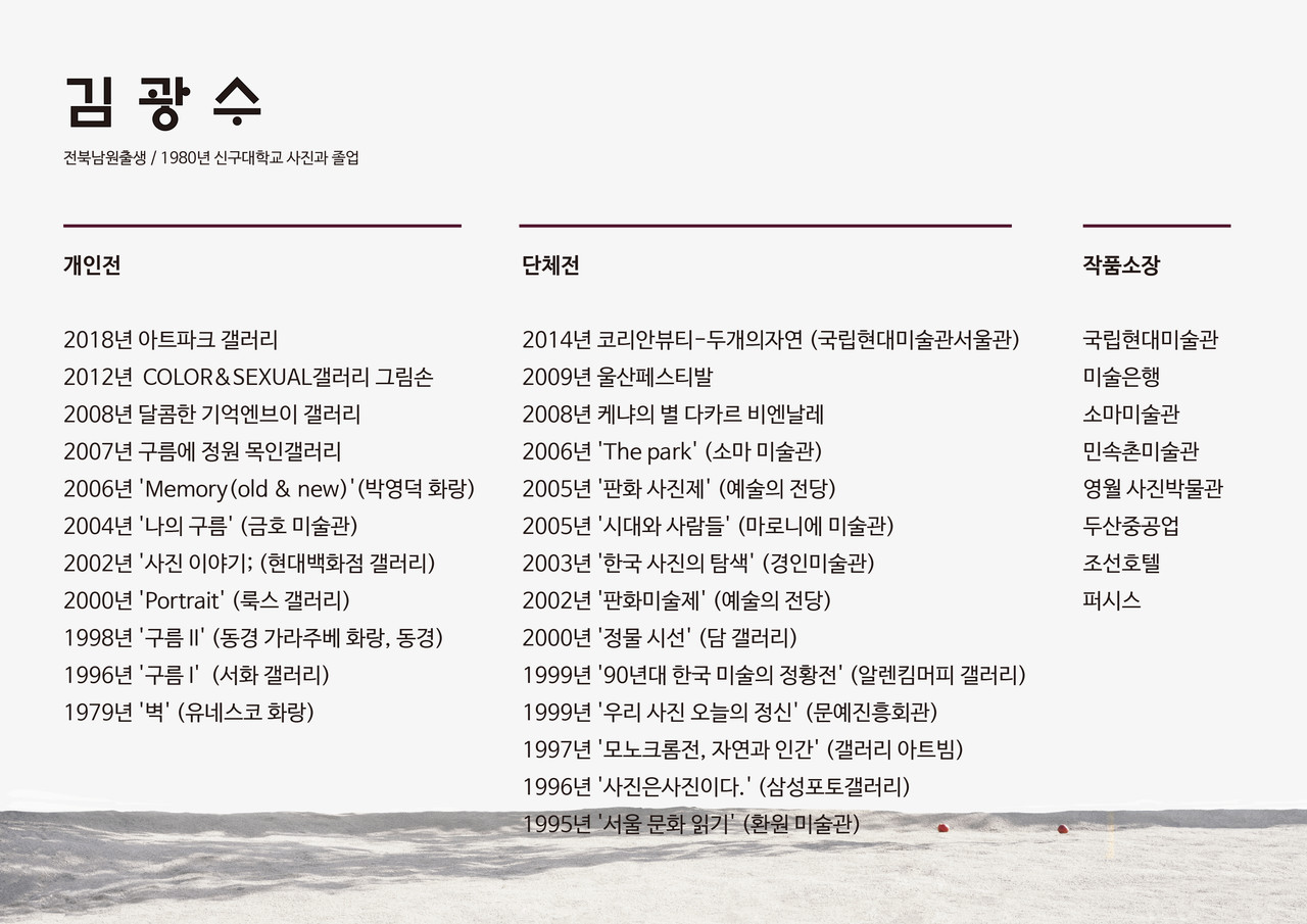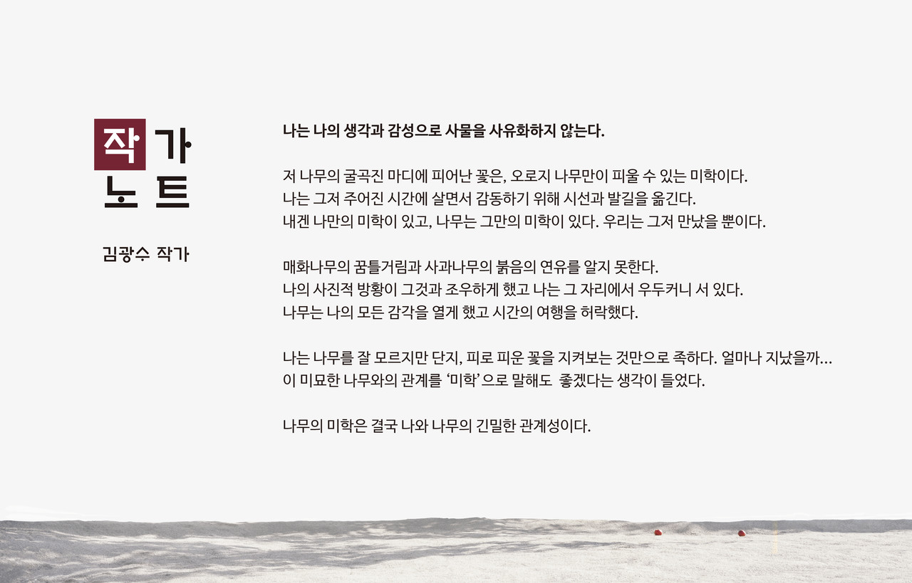 감나무_1800X2485_pigment print_2015 뉴튼의사과_1580X2064_Pigment Print_2018 사과나무_240X15100_pigment rint_2015 사과나무_1510X2200_pigment print_2013 사과나무_1700X1130_pigment print_2007 사과나무_2000x3770_Pigment Print_2018 사과나무_2400X1500_pigment print_2015 사과나무_2400X1500_pigment print_2015 이브의 사과 _2500X1430_pigment print_2009 진달래_1400X1700_pigment print_2015 진달래_1440X1900_pigment print_2017 진달레_1580X2100_Pigment Print_2019 홍매화_1600x2050_pigment print_2013 캔디시리즈 메모리 피라미드_55X44cm 일루전_55X44cm 스윙 플라잉1_55X44cm 플라잉2_55X44cm 러브홀릭_55X46cm 낭만형제 2005. 환타지01 60x50cm 게임 아톰과 UFO 황홀한 충돌 키워드 #김광수 #사과나무 #진달래 #이브의사과 #감나무 #나무의 미학 #캔디시리즈 기획 / 박미애 기자 twindaol2@hanmail.net 다른기사 보기 저작권자 © 이치저널(each journal) 무단전재 및 재배포 금지 당신만 안 본 뉴스 새만금국제공항과 철도 연결, 48km의 경제동맥이 열린다 쿠바 전역에 ‘여행경보 1단계(여행유의)’ 발령, 모기매개 전염병 급증 징후 화산과 바다가 만든 걸작, 부안 지질유산...부안 격포리와 솔섬 농촌 재생에너지 전환, 이제는 영농형 태양광이 중심 2025년 스마트도시 지도 바뀌다… 9개 도시 신규 인증 ‘나만 괜찮다’는 교차로 꼬리물기, 자동 단속장비 AI가 직접 잡는다 남미 가뭄 뚫은 한국 기술… ‘가뭄에 강한 콩’ 현지서 성공 새만금국제공항과 철도 연결, 48km의 경제동맥이 열린다 댓글삭제 삭제한 댓글은 다시 복구할 수 없습니다. 그래도 삭제하시겠습니까? 비밀번호 닫기 기사 댓글 0 댓글 접기 로그인 후 이용 가능합니다. 댓글 내용입력 비회원 로그인 이름 비밀번호 댓글 내용입력 댓글쓰기 계정을 선택하시면 로그인·계정인증을 통해 댓글을 남기실 수 있습니다. 회원 로그인 비회원 글쓰기 이름 비밀번호 자동등록방지 로그인 옵션 창닫기 주요기사 내년, 광역버스 지도가 바뀐다… 광명·부천·수원·용인·이천까지 ‘준공영제 직행 확장’ 죽전테라스앤139, 폭행 의혹·점유 충돌·극단 선택 시도까지… 교보자산신탁 관리사업에서 갈등 폭발 바이러스보다 무서운 염증 ,,,엠폭스 중증화의 스위치, AIM2가 밝혀졌다 국세 카드납부 수수료 12월 2일 전면 인하… 영세사업자 부담 절반으로 국민연금 추후 납부, 보험료율 새 기준 적용… 내년부터 달라진다 산부인과·소아외과 의사, 의료사고 배상액 국가가 최대 15억 보장