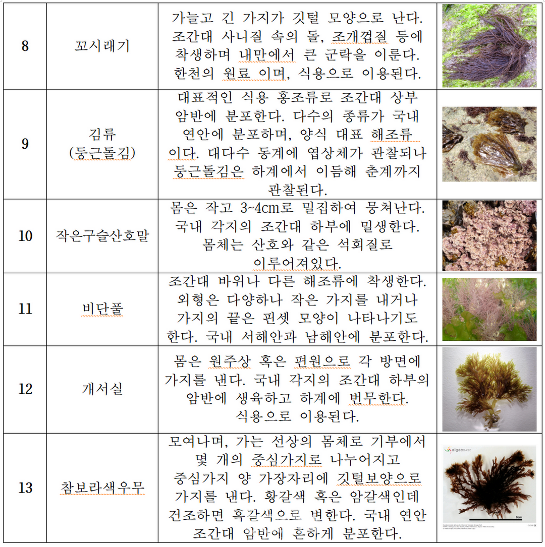 다도해해상국립공원 진도지역에서는 뜸부기, 구멍갈파래, 톳, 지충이, 바위수염, 진두발, 미역쇠, 꼬시래기, 김, 작은구슬산호말, 비단풀, 개서실, 참보라색우무 등 13종의 해조류가 부착한 것을 확인할 수 있었습니다.