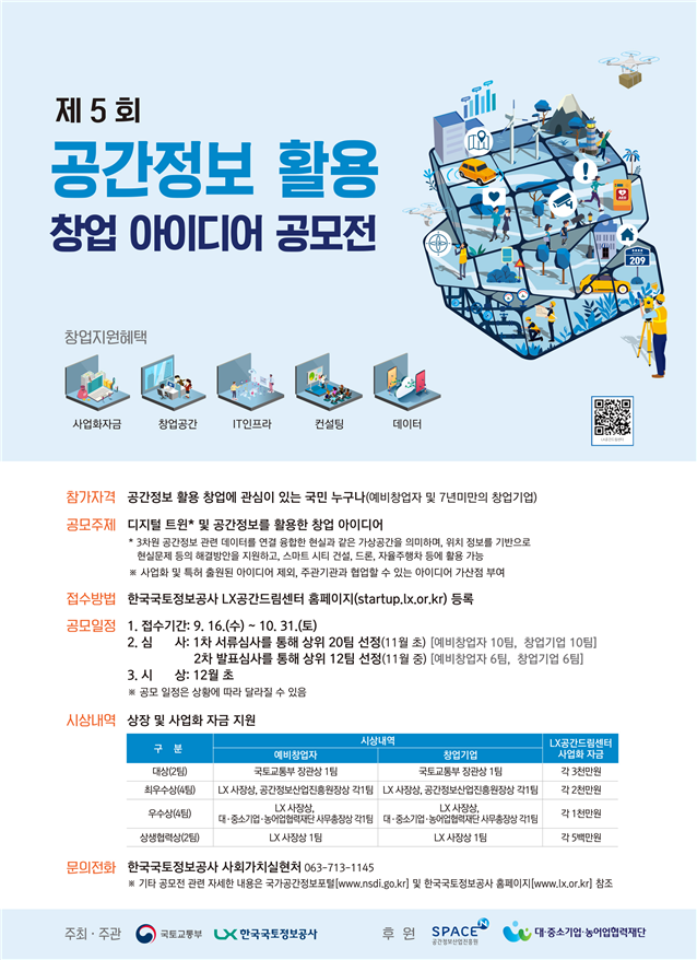 국토교통부(장관 김현미)는 9월 16일부터 10월 31일까지(46일간) 국토교통부가 주최하고, 한국국토정보공사(사장 김정렬, 이하 ‘LX’)가 주관하는「공간정보 활용 창업 아이디어 공모전(이하 ‘공모전’)」을 개최한다.