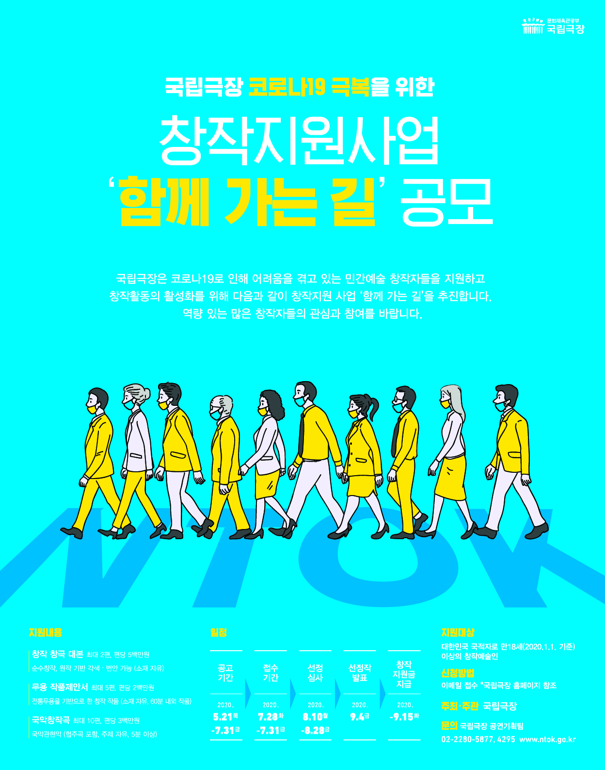 전통예술분야 창작 공모사업 ‘함께 가는 길’의 창작지원작 15편을 선정했다고 국립극장은 밝혔다. 지난 5월 21일 공모를 알린 ‘함께 가는 길’은 국립극장이 코로나19로 활동에 어려움을 겪고 있는 민간 예술창작자를 지원하고 창작활성화에 기여하고자 추진한 사업이다. 선정된 작품에는 최대 5백만 원까지 창작지원금이 주어지며, 창작자는 국립극장과 해당 작품의 공연화를 협상할 수 있다.