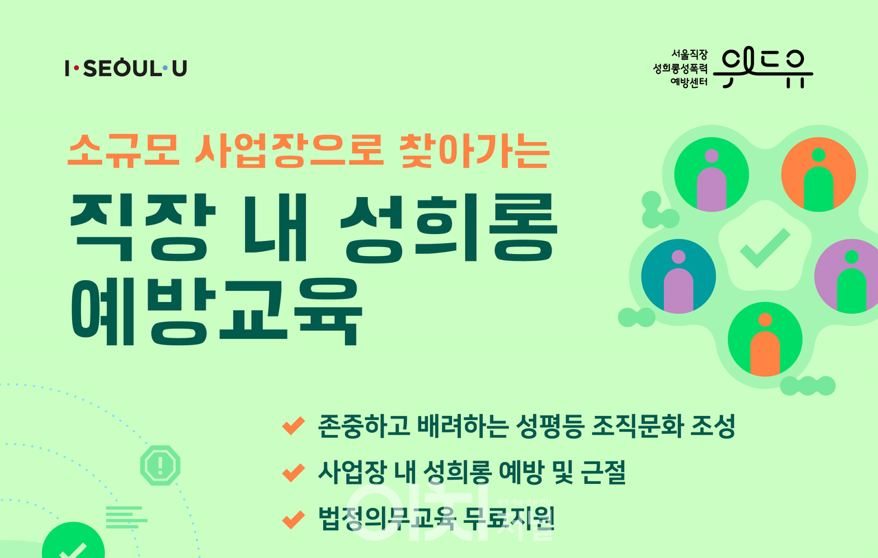 관심있는 소규모 사업장은 위드유 서울직장성희롱성폭력예방센터 홈페이지(www.seoulwithu.kr)에서 신청하면 ▴성희롱 예방교육 ▴조직관리 컨설팅 ▴고충처리 담당자 교육 ▴사건처리지원까지 받을 수 있다.