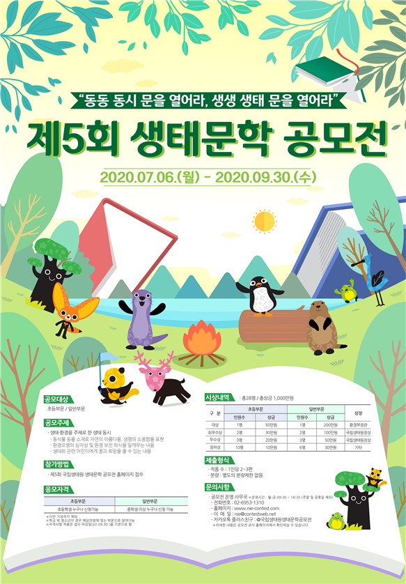 환경부 산하 국립생태원(원장 박용목)은 생태와 환경에 대한 이해와 생태적 감수성 함양을 위해 ‘제5회 국립생태원 생태문학(동시분야) 공모전’을 7월 6일부터 9월 30일까지 개최한다.