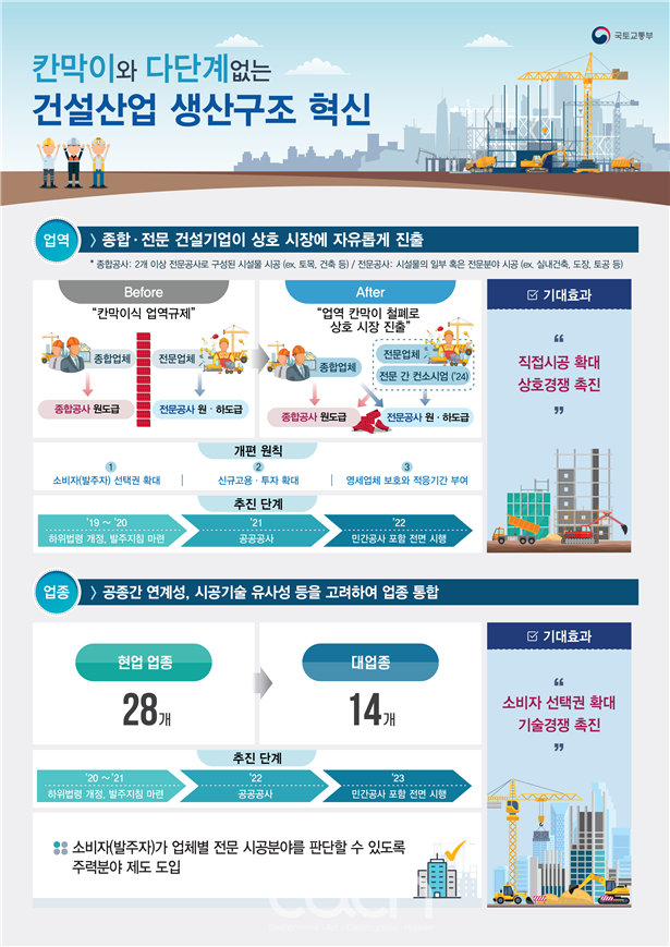 국토교통부는 건설산업 생산구조 혁신의 첫 단계로 2018년 말에 지난 40년 간 유지되어온 종합건설업과 전문건설업 간 업역을 폐지한 데 이어, 종합 및 전문건설업 내 업종체계 전면 개편을 추진한다고 밝혔다.