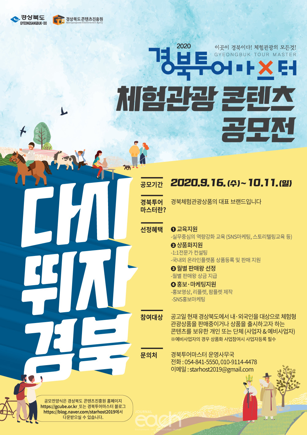 경상북도와 경상북도콘텐츠진흥원은 ‘2020 경북투어마스터 - 체험관광콘텐츠 공모전’을 9월 16일부터 10월 11일까지 개최한다.
