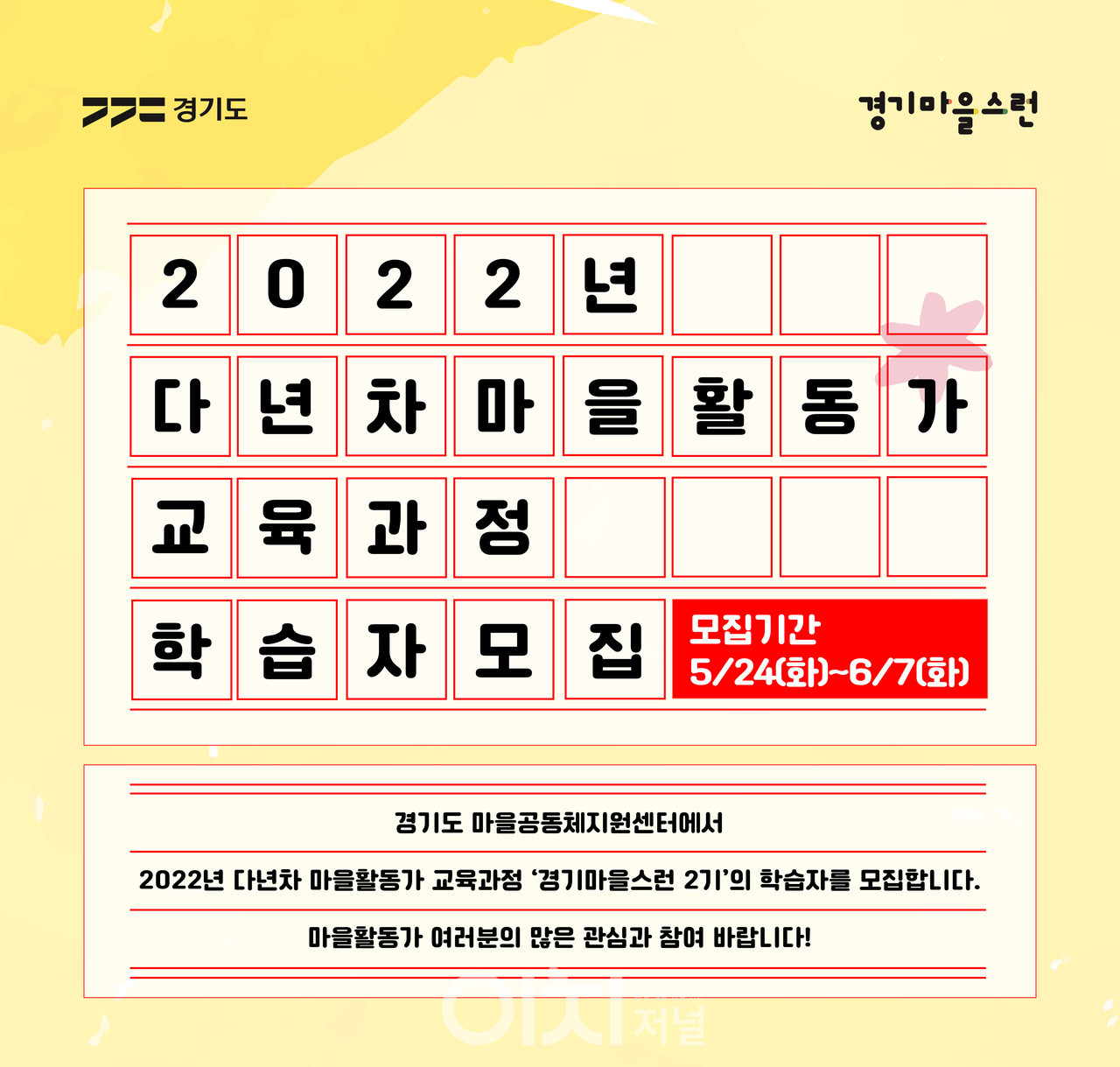 선착순 마감 예정이며 선정된 최종 학습자는 6월 10일에 발표한다. 신청 방법은 경기도 마을공동체지원센터 누리집(ggmaeul.or.kr)에서 신청서를 내려받아 작성 후 전자우편으로 제출하면 된다.