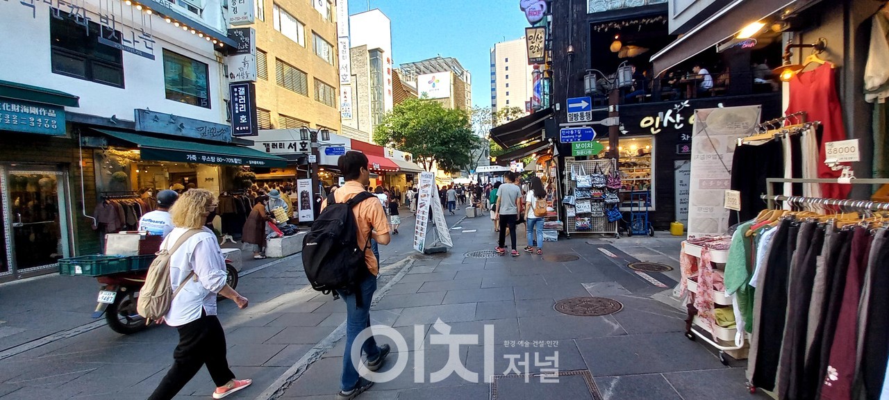젊은 청춘들이 길거리에서 고기 굽는 문화를 즐기고 있다. 사람들의 마음을 붙잡는 인사동 문화가 필요해진다.