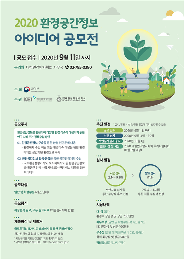 환경부(장관 조명래)는 한국환경정책·평가연구원, (사)대한원격탐사학회와 공동으로 다양한 분야에서 환경공간정보의 활용도를 높이기 위해 ‘2020 환경공간정보 아이디어 공모전’을 개최한다고 밝혔다.