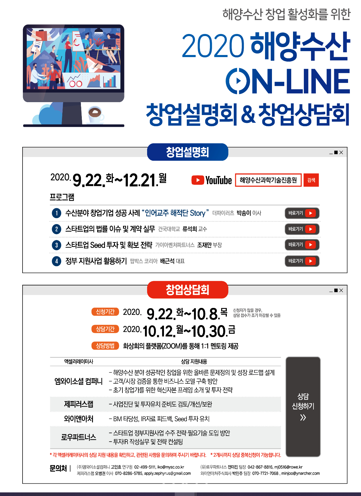 해양수산부(장관 문성혁)는 해양수산 분야 창업을 활성화하기 위해 9월 22일(화)부터 12월 21일(금)까지 ‘해양수산 온라인 창업설명회’를 진행한다.