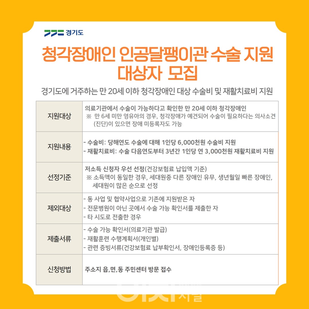 경기도가 ‘청각장애인 인공달팽이관 수술 및 재활 지원 사업’ 대상자를 올해 상반기 5명 선정한 데 이어 8월 12일까지 7명을 추가 모집한다.