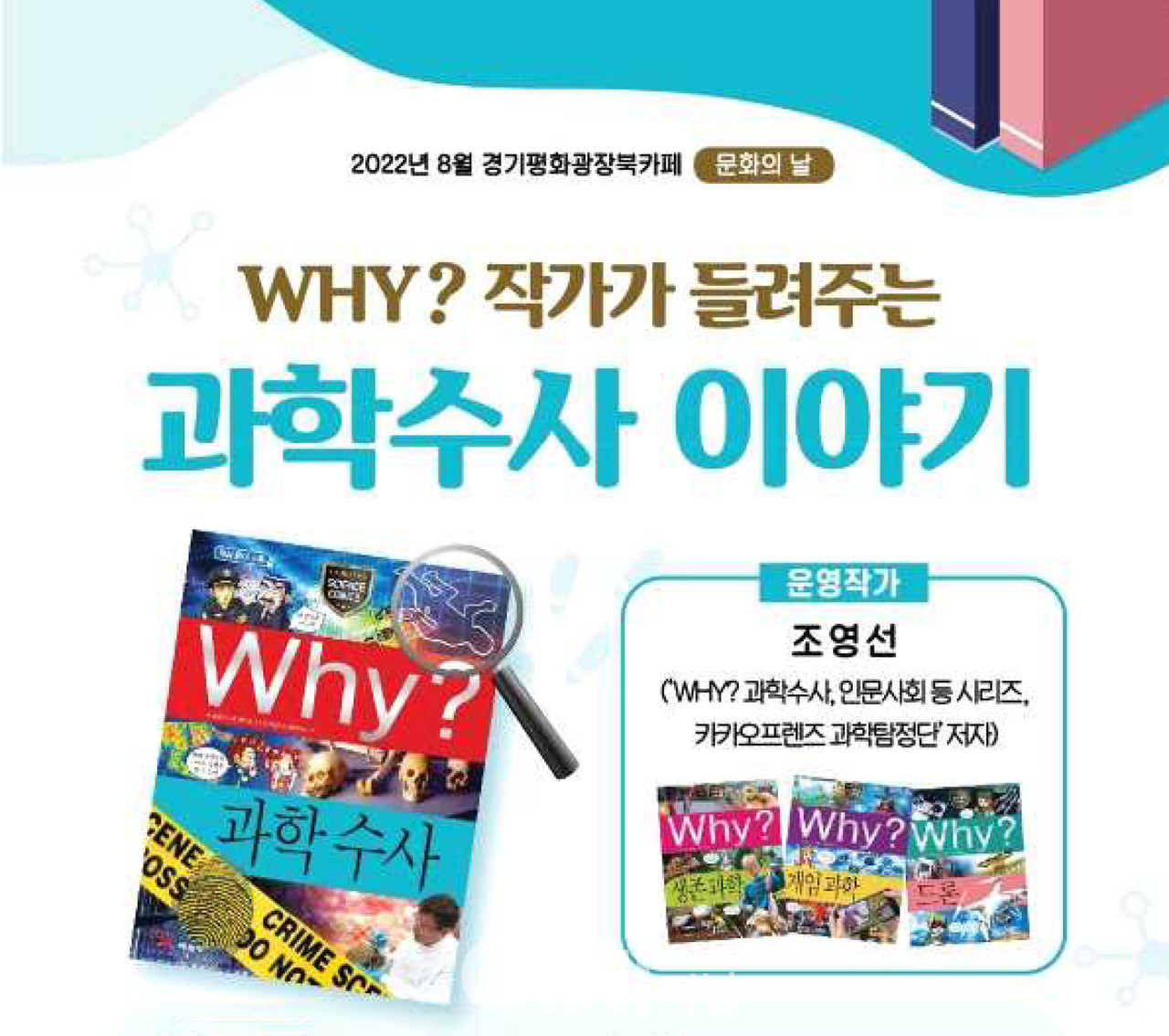 경기도는 ‘경기평화광장 북카페 8월 문화의 날 프로그램’으로 오는 8월 11일(목) 오후 4시부터 <WHY? 작가가 들려주는 과학수사 이야기>를 개최한다고 3일 밝혔다.