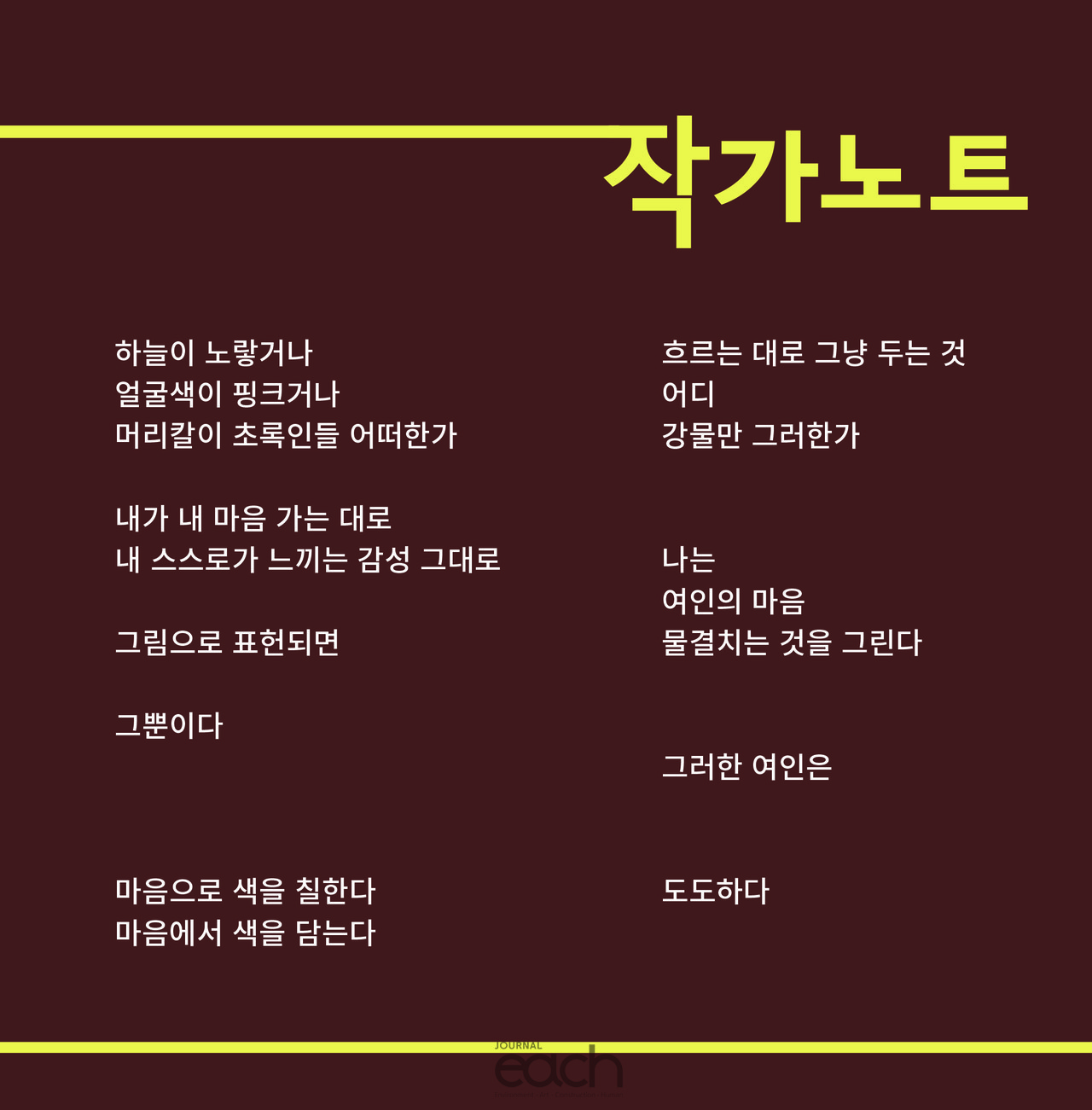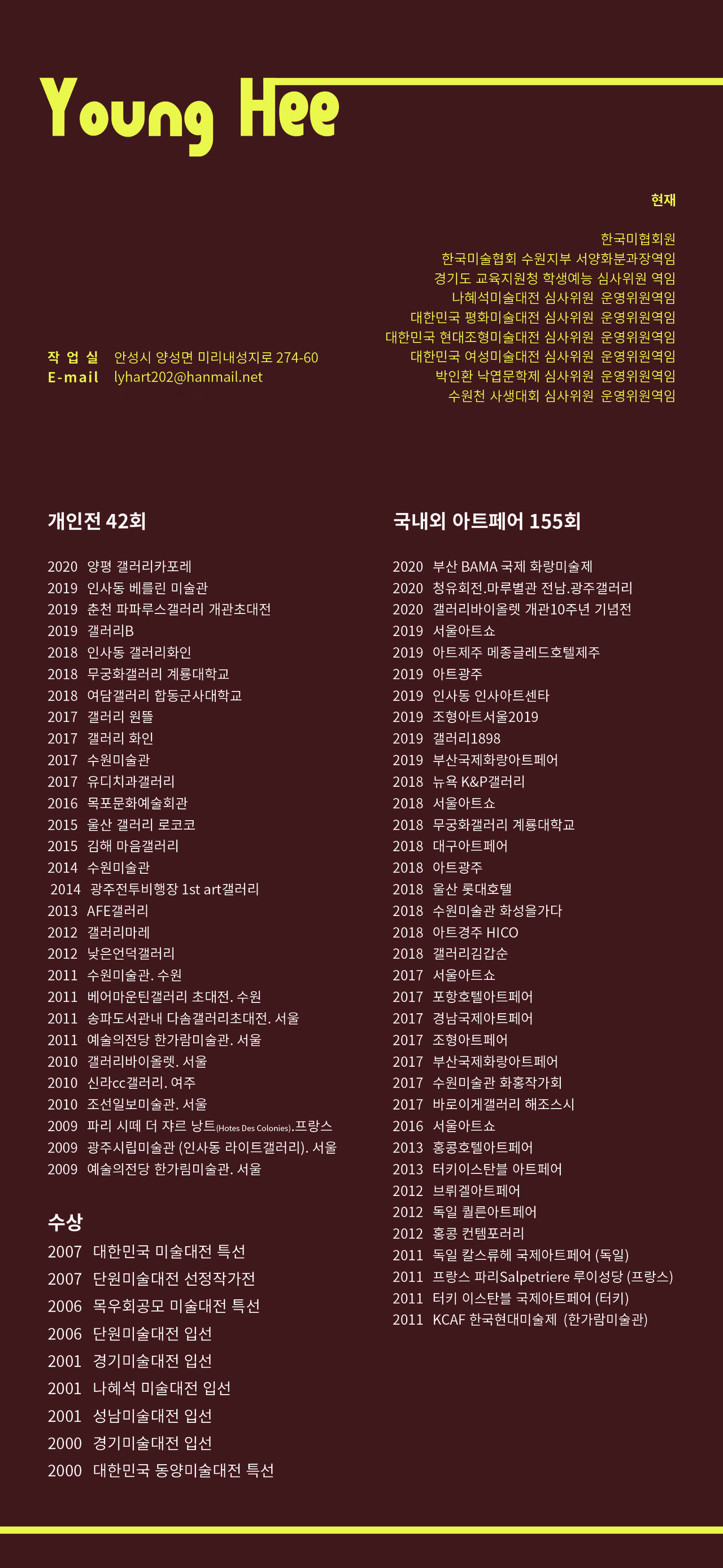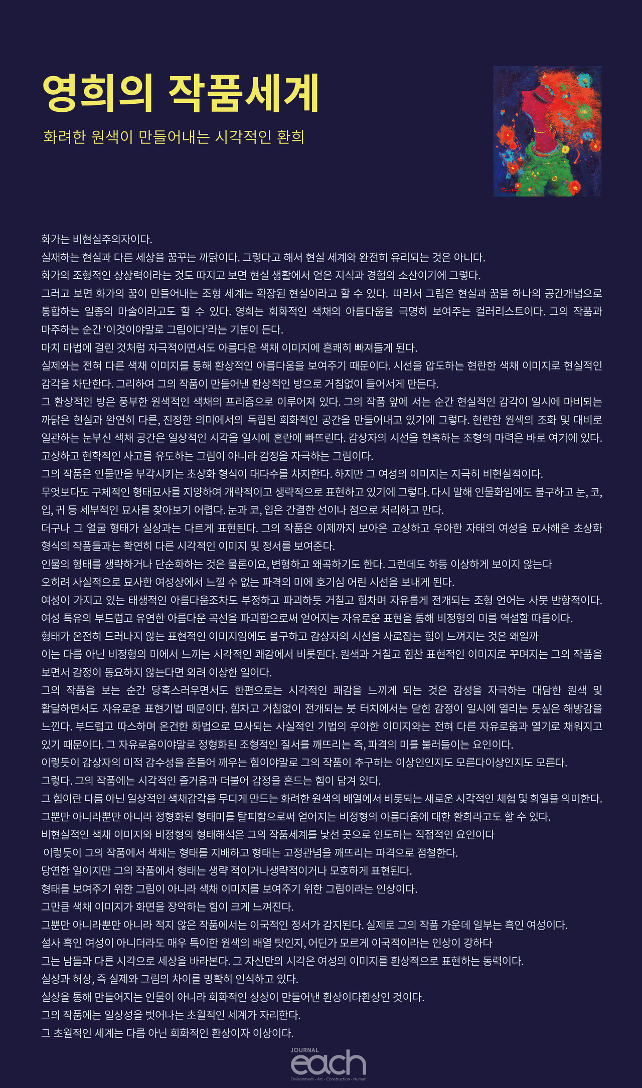 1.파티에간 여인 90.9+65.1 mixd media 2015 2.바람불어좋은날90.9+65.1 2015 3.도도한그녀 116.8+72.7 mixedmedia on canvas 2011 4.봄바람 138.0+100 mixedmedia on canvas 2012년 5.그녀-선물 90.9+65.1 mixed media 2018 6.그녀- 꽃나드리 65.2+53.0cm mixed media 2019 7.그녀-가을놀이 72.7+53.0 mixed media..2019 8.그녀-빨강머리앤 72.7+53.0 mixed media 2018 9.음악에취한-그녀 90.9+60.6 2018 10.그녀-들꽃소녀 60.6+50.0 2020 11.사랑-그리고꽃 53.0+45.5 2020 12.사랑-그리고기다림 90.9+65.1 2019 13..그녀-기다림 90.9+65.1 mixed media. .2019 14.수줍은여인 53.0+45.5 .2016 15.그녀-수줍다 65+53 mixed media 2012 16.그녀-몽 53+46 2012 17.핑크머리여인 53.0+45.5 mixedmedia. .2012 18.그녀-바라보다 72.7+60.6 mixed media 2009 19..파리의여인 65.1+53.0 mixed media 2011 20.그녀들의수다 72.7+53.0 mixed media..2017 21그녀들의환희 162.2+130.3...2012년 그녀들은 각자맘껏뽐내면서 최고의 파티를 22.여인들의 행복놀이 162.2+130.3.. 2013년 23.무희 116.8+91.0 mixedmedia. .2013 23그녀-자매 116.8+91.0. Mixed media..2014 키워드 #도도한여인 #영희 #화려한원색 #시각적인환희 #내마음가는대로 #여인의마음 기획 / 박미애 기자 twindaol2@hanmail.net 다른기사 보기 저작권자 © 이치저널(each journal) 무단전재 및 재배포 금지 당신만 안 본 뉴스 새만금국제공항과 철도 연결, 48km의 경제동맥이 열린다 쿠바 전역에 ‘여행경보 1단계(여행유의)’ 발령, 모기매개 전염병 급증 징후 화산과 바다가 만든 걸작, 부안 지질유산...부안 격포리와 솔섬 농촌 재생에너지 전환, 이제는 영농형 태양광이 중심 2025년 스마트도시 지도 바뀌다… 9개 도시 신규 인증 ‘나만 괜찮다’는 교차로 꼬리물기, 자동 단속장비 AI가 직접 잡는다 남미 가뭄 뚫은 한국 기술… ‘가뭄에 강한 콩’ 현지서 성공 새만금국제공항과 철도 연결, 48km의 경제동맥이 열린다 댓글삭제 삭제한 댓글은 다시 복구할 수 없습니다. 그래도 삭제하시겠습니까? 비밀번호 닫기 기사 댓글 0 댓글 접기 로그인 후 이용 가능합니다. 댓글 내용입력 비회원 로그인 이름 비밀번호 댓글 내용입력 댓글쓰기 계정을 선택하시면 로그인·계정인증을 통해 댓글을 남기실 수 있습니다. 회원 로그인 비회원 글쓰기 이름 비밀번호 자동등록방지 로그인 옵션 창닫기 주요기사 내년, 광역버스 지도가 바뀐다… 광명·부천·수원·용인·이천까지 ‘준공영제 직행 확장’ 죽전테라스앤139, 폭행 의혹·점유 충돌·극단 선택 시도까지… 교보자산신탁 관리사업에서 갈등 폭발 바이러스보다 무서운 염증 ,,,엠폭스 중증화의 스위치, AIM2가 밝혀졌다 국세 카드납부 수수료 12월 2일 전면 인하… 영세사업자 부담 절반으로 국민연금 추후 납부, 보험료율 새 기준 적용… 내년부터 달라진다 산부인과·소아외과 의사, 의료사고 배상액 국가가 최대 15억 보장