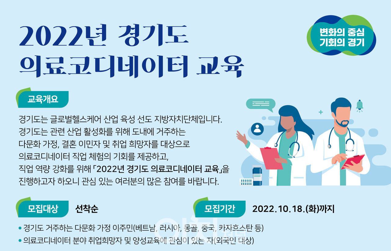 경기도는 오는 18일까지 도내 다문화가정 이주민, 결혼이민자, 의료코디네이터 분야 취업희망 외국인 등을 대상으로 한 ‘2022년 경기도 의료코디네이터 교육’ 참가자를 선착순으로 모집한다고 6일 밝혔다.