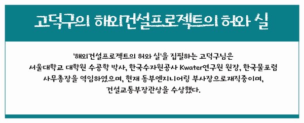 필자는 과거 한국수자원공사, K-water에서 연구원으로서, 회사의 일부 해외사업 및 국제협력업무에도 참여했고, 사단법인 한국물포럼에 파견되어서는 2015년 세계물포럼을 우리나라 대구에서 개최하는 업무를 수행하기도 했다. 특히 물 분야에서의 국내 건설관련 기업들이 해외에 진출하여 사업을 수행하기 위한 방안을 모색하는 연구를 수행하기도 하였다.