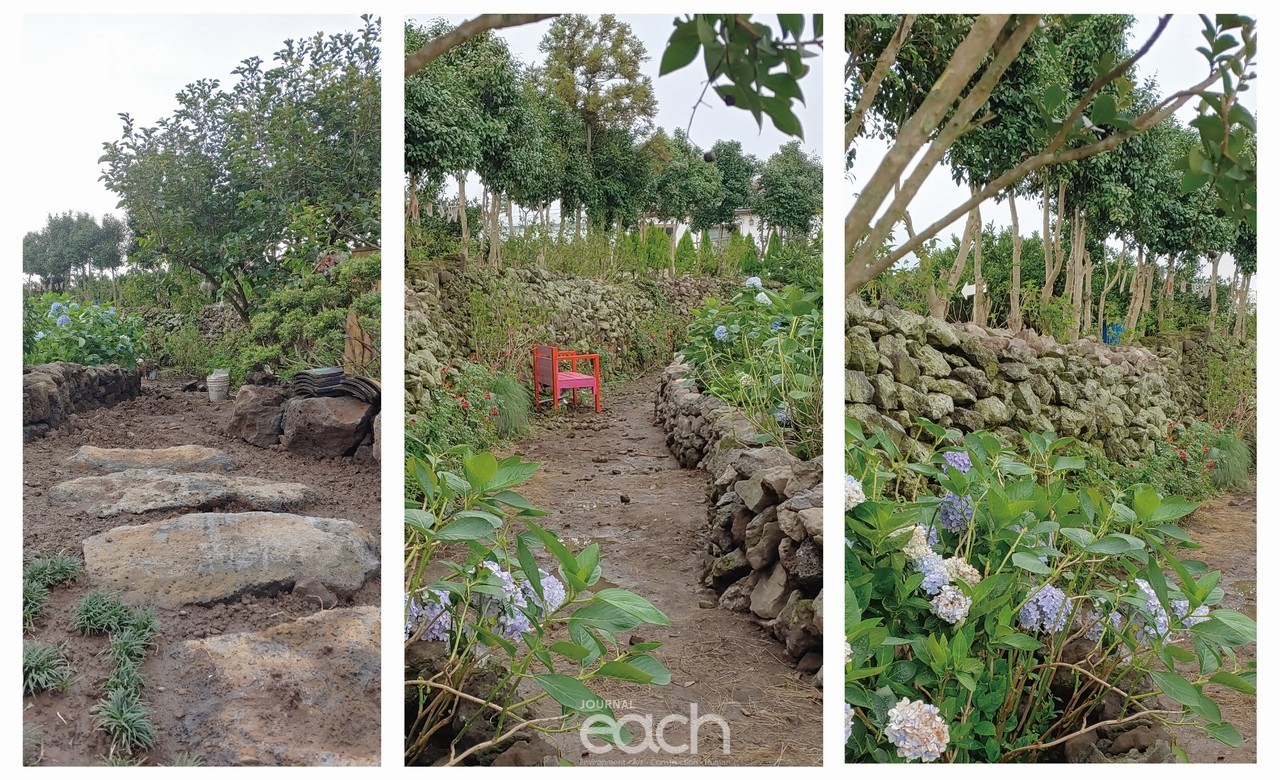 기존 높은 돌담길과 두 사람이 어깨를 나란히 하며 걸을 만큼의 간격을 두고 수국을 옮겨 심고 수국 앞으로 돌담을 쌓기로 했다. 걸었을 때 무릎 정도의 높이로 나지막한 돌담을 새로 쌓아 수국이 낮은 돌담 위로 쏟아지게 연출하여 걷고 싶은 수국돌담 산책길을 만들자고 의견을 모았다.