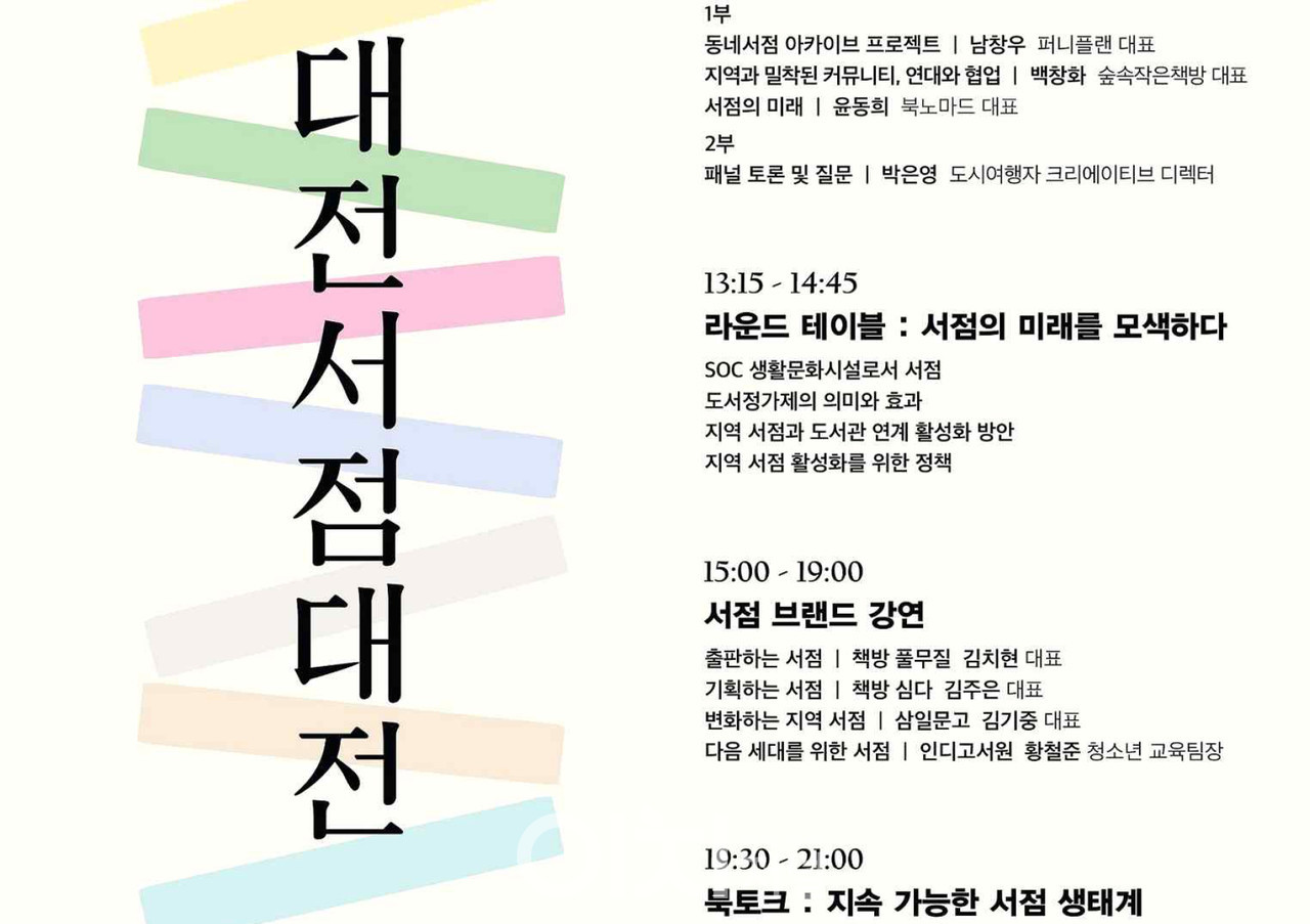 ‘2022 대전 서점대전’은 ▲‘서점의 미래, 변화하는 서점’이라는 주제의 정책 컨퍼런스 ▲동네서점 아카이브 프로젝트 등 기조 강연 ▲지역서점 활성화를 위한 라운드 테이블 ▲전국각지에서 찾아온 지역서점 대표들의 ‘서점 브랜드 강연’▲서점 생태계 관련 저자 북토크 등 다채로운 행사로 마련됐다.