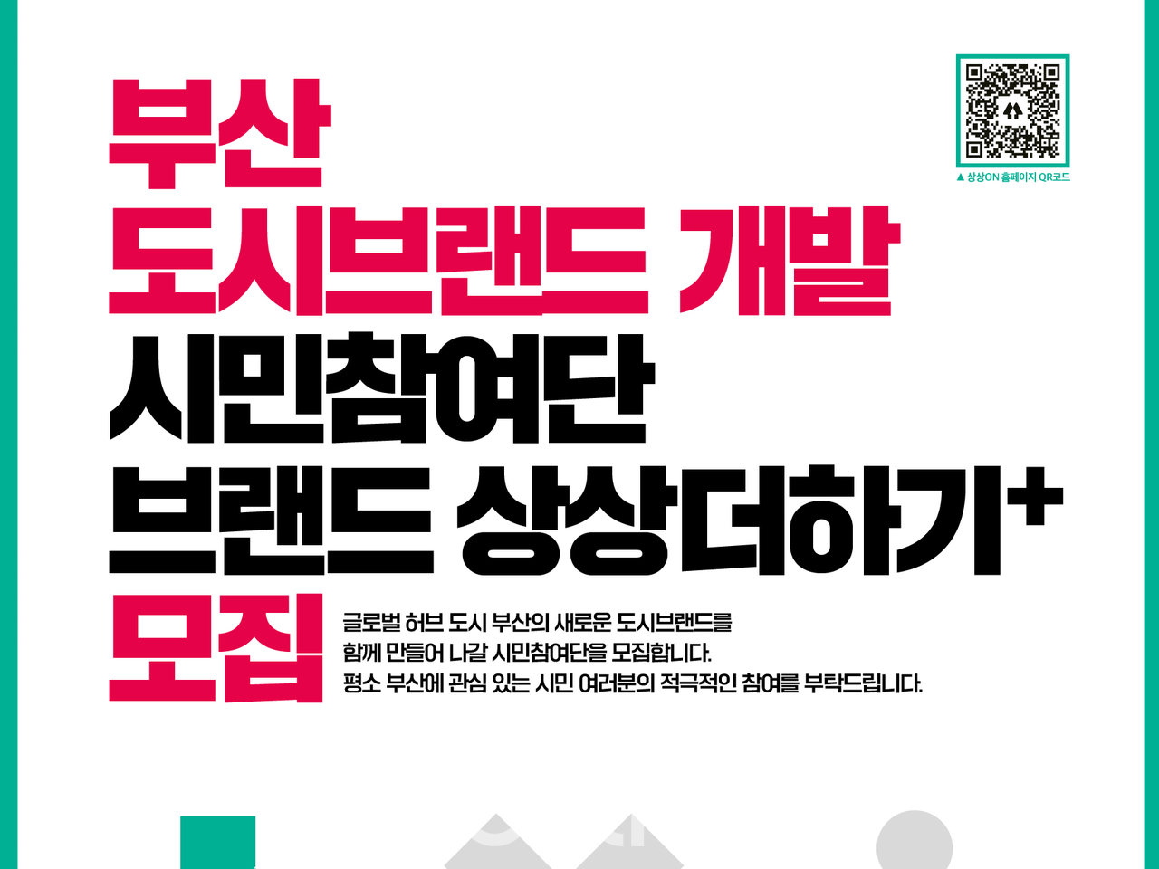 부산시는 부산의 새로운 도시브랜드에 시민의 상상력을 더하고, 시민 활동을 보장하기 위해 도시브랜드 시민참여단 ‘브랜드 상상더하기+’를 11월 24일(목)부터 12월 5일(월)까지 12일간 공개 모집한다고 밝혔다.