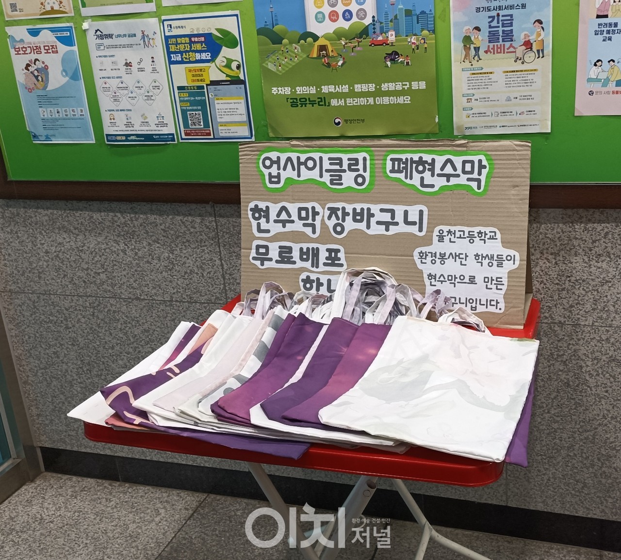 율천고등학교(교장 전호진) 환경봉사단은 폐현수막으로 장바구니를 만들어 화서2동 행정복지센터에 기증했다.
