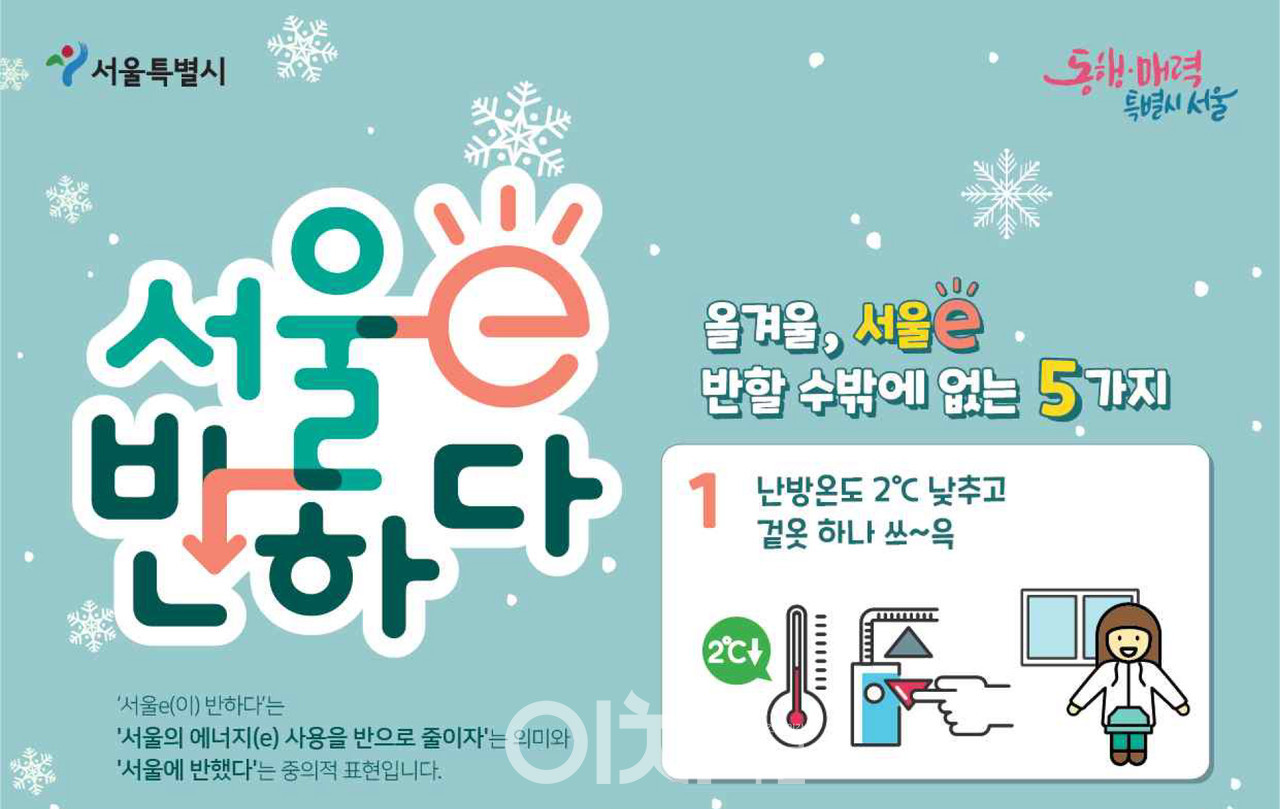 올겨울 전 세계적인 에너지 위기로 사회 전반에 걸친 에너지절약이 강조되는 가운데, 서울시와 녹색서울시민위원회(공동위원장 이경희 환경정의 이사장)가 ‘서울 e(이) 반하다’ 캠페인을 전개한다.