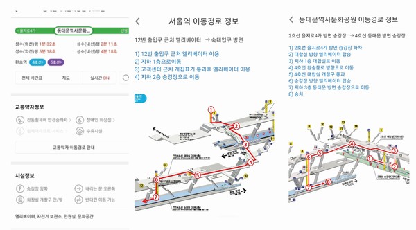우선, 교통약자를 위한 장애인 화장실, 수유시설, 휠체어 리프트, 전동휠체어 충전 등 편의시설 위치뿐만 아니라, ’교통약자 이동경로 안내‘ 버튼을 누르고 이동구간을 선택하면 철도역사 도면을 바탕으로 출입구와 환승이동 경로 등 단계별 이동 및 환승경로를 한 눈에 확인할 수 있다.