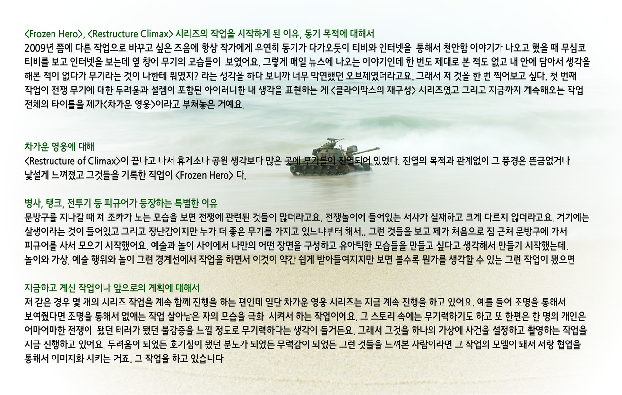 Romantic Soldiers #7 -Pigment Print 120X60cm 2011 Romantic Soldiers #9 -Pigment Print 120X60cm 2011 Romantic Soldiers #10-Pigment Print 120X60cm 2011 Romantic Soldiers #11-Pigment Print 120X60cm 2011 Romantic Soldiers #13-Pigment Print 120X60cm 2011 Romantic Soldiers #16-Pigment Print 120X60cm 2014 Romantic Soldiers #21-Pigment Print 120X60cm 2014 Romantic Soldiers #24-Pigment Print 120X60cm 2014 Last Scene #2 Pigment Print 120X180cm 2012 Last Scene #2 Pigment Print 120X180cm 2012 Last Scene #2 Pigment Print 120X180cm 2012 Last Scene #2 Pigment Print 120X180cm 2012 Last Scene #9 Pigment Print 60X120cm 2012 Last Scene #11 Pigment Print 60X120cm 2012 Frozen Objects#1 Pigment Print 60X120cm 2015 Frozen Objects#3 Pigment Print 60X120cm 2015 Frozen Objects#5 Pigment Print 60X120cm 2015 Frozen Objects#6 Pigment Print 60X120cm 2015 Frozen Objects#7 Pigment Print 60X120cm 2015 Frozen Objects#10 Pigment Print 60X120cm 2015 임안나_Frozen Objects#8_Pigment Print_60x120cm_2015 임안나_Frozen Objects#12_Pigment Print_60x120cm_2015 키워드 #임안나 #FrozenObjects #LastScene #RomanticSoldiers 기획 : 박미애 기자 twindaol2@hanmail.net 다른기사 보기 저작권자 © 이치저널(each journal) 무단전재 및 재배포 금지 당신만 안 본 뉴스 새만금국제공항과 철도 연결, 48km의 경제동맥이 열린다 쿠바 전역에 ‘여행경보 1단계(여행유의)’ 발령, 모기매개 전염병 급증 징후 화산과 바다가 만든 걸작, 부안 지질유산...부안 격포리와 솔섬 농촌 재생에너지 전환, 이제는 영농형 태양광이 중심 2025년 스마트도시 지도 바뀌다… 9개 도시 신규 인증 ‘나만 괜찮다’는 교차로 꼬리물기, 자동 단속장비 AI가 직접 잡는다 남미 가뭄 뚫은 한국 기술… ‘가뭄에 강한 콩’ 현지서 성공 새만금국제공항과 철도 연결, 48km의 경제동맥이 열린다 댓글삭제 삭제한 댓글은 다시 복구할 수 없습니다. 그래도 삭제하시겠습니까? 비밀번호 닫기 기사 댓글 0 댓글 접기 로그인 후 이용 가능합니다. 댓글 내용입력 비회원 로그인 이름 비밀번호 댓글 내용입력 댓글쓰기 계정을 선택하시면 로그인·계정인증을 통해 댓글을 남기실 수 있습니다. 회원 로그인 비회원 글쓰기 이름 비밀번호 자동등록방지 로그인 옵션 창닫기 주요기사 내년, 광역버스 지도가 바뀐다… 광명·부천·수원·용인·이천까지 ‘준공영제 직행 확장’ 죽전테라스앤139, 폭행 의혹·점유 충돌·극단 선택 시도까지… 교보자산신탁 관리사업에서 갈등 폭발 바이러스보다 무서운 염증 ,,,엠폭스 중증화의 스위치, AIM2가 밝혀졌다 국세 카드납부 수수료 12월 2일 전면 인하… 영세사업자 부담 절반으로 국민연금 추후 납부, 보험료율 새 기준 적용… 내년부터 달라진다 산부인과·소아외과 의사, 의료사고 배상액 국가가 최대 15억 보장